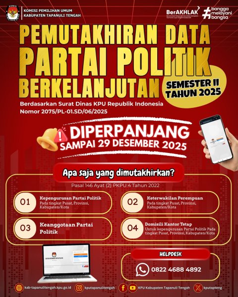#TemanPemilih Pemutakhiran Data Partai Politik Berkelanjutan Semester II Tahun 2025! Diperpanjang sampai 29 Desember 2025 Partai Politik dapat melaksanakan Pemutakhiran Data melalui SIPOL sesuai PKPU 4 Tahun 2022. Data yang dimutakhirkan meliputi: 1. Kepengurusan Partai Politik; 2. Keterwakilan Perempuan; 3. Keanggotaan Partai Politik; 4. Domisili Kantor Tetap. Segera lakukan pemutakhiran data dan dokumen Partai Politik Anda. Pemutakhiran dilakukan oleh setiap tingkatan Partai Politik melalui Akun SIPOL. Sehubungan dengan Masa Tanggap Bencana yang sedang melanda Kabupaten Tapanuli Tengah, Komisi Pemilihan Umum Kabupaten Tapanuli Tengah membuka Helpdesk Pemutakhiran Data Partai Politik Semester II Tahun 2025. Untuk informasi dan koordinasi lebih lanjut, dapat menghubungi: 0822 4688 4892 (Ilseria Zuidar Lubis) ....