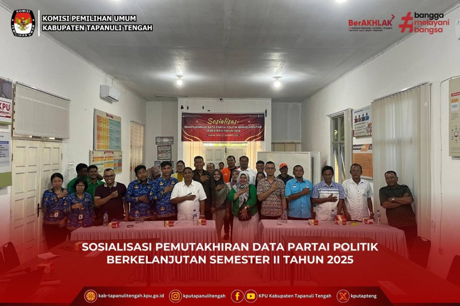 KPU Kabupaten Tapanuli Tengah melaksanakan kegiatan Sosialisasi Pemutakhiran Data Partai Politik Secara Berkelanjutan melalui Aplikasi Sistem Informasi Partai Politik (SIPOL), bertempat di Aula KPU Kabupaten Tapanuli Tengah, Senin (22/12/2025). Kegiatan ini dihadiri oleh Ketua dan Anggota KPU Kabupaten Tapanuli Tengah, yaitu Wahid Pasaribu selaku Ketua KPU, Mhd. Fadli Wanri Putra Hutagalung selaku Ketua Divisi Perencanaan, Data, dan Informasi (Rendatin), Helman Tambunan selaku Ketua Divisi Teknis Penyelenggaraan Pemilu, serta Abdul Haris Nasution selaku Ketua Divisi Hukum dan Pengawasan, bersama jajaran Sekretariat KPU Kabupaten Tapanuli Tengah. Turut hadir perwakilan Bawaslu Kabupaten Tapanuli Tengah serta perwakilan Partai Politik se-Kabupaten Tapanuli Tengah. Acara dibuka secara resmi oleh Ketua KPU Kabupaten Tapanuli Tengah, Wahid Pasaribu, kemudian dilanjutkan dengan pemaparan materi oleh Ketua Divisi Teknis Penyelenggaraan Pemilu, Helman Tambunan, dengan tema Pemutakhiran Data Partai Politik. Adapun data Partai Politik yang dimutakhirkan dalam kegiatan ini meliputi beberapa poin, antara lain: 1. Kepengurusan Partai Politik pada tingkat Pusat, Provinsi, Kabupaten/Kota, dan Kecamatan; 2. Keterwakilan perempuan pada kepengurusan Partai Politik tingkat Pusat, Provinsi, dan Kabupaten/Kota; 3. Keanggotaan Partai Politik; 4. Domisili kantor tetap kepengurusan Partai Politik tingkat Pusat, Provinsi, dan Kabupaten/Kota. ....