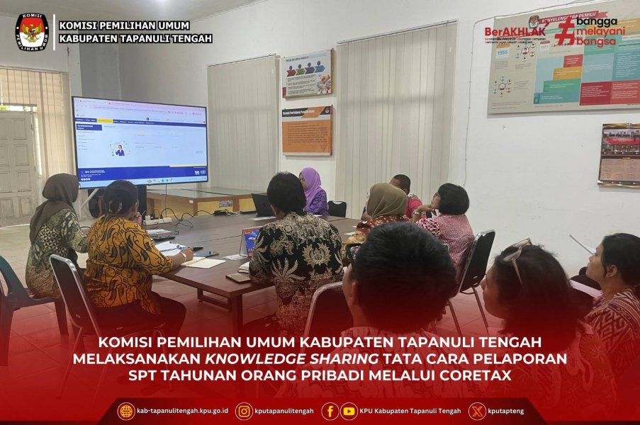 Komisi Pemilihan Umum Kabupaten Tapanuli Tengah melaksanakan kegiatan Knowledge Sharing Tata Cara Pelaporan SPT Tahunan Orang Pribadi melalui aplikasi Coretax pada Jumat (13/02/2026), bertempat di Aula Kantor KPU Kabupaten Tapanuli Tengah. Kegiatan ini bertujuan untuk mengingatkan serta meningkatkan pemahaman seluruh ASN KPU Tapanuli Tengah terkait tata cara pengisian dan pelaporan SPT Tahunan Pajak Penghasilan Orang Pribadi melalui sistem Coretax, sehingga pelaksanaan kewajiban perpajakan dapat dilakukan secara tepat waktu dan tanpa kendala. Adapun yang bertindak sebagai pemateri dalam kegiatan ini adalah Bendahara Nova Rincan Juliana Hutauruk serta Raveena Staf Subbag Keuangan, Umum, dan Logistik, yang sebelumnya telah mengikuti Bimbingan Teknis pembuatan bukti pemotongan PPh Pasal 21 Masa Pajak Terakhir (BPA1/BPA2) melalui Coretax pada KPPN Sibolga. Melalui kegiatan ini diharapkan seluruh jajaran semakin tertib administrasi dan patuh terhadap kewajiban perpajakan sebagai bagian dari komitmen ASN dalam mendukung tata kelola pemerintahan yang akuntabel dan transparan. ....