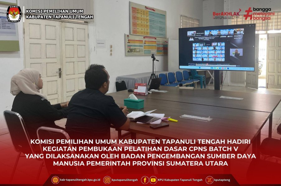 #temanpemilih, Komisi Pemilihan Umum (KPU) Kabupaten Tapanuli Tengah menghadiri kegiatan Pembukaan Pelatihan Dasar (Latsar) Calon Pegawai Negeri Sipil (CPNS) Batch 4 serta ceramah Muatan Teknis Substansi Lembaga (MTSL) yang diselenggarakan oleh Badan Pengembangan Sumber Daya Manusia (BPSDM) Provinsi Sumatera Utara secara daring melalui Zoom Meeting, Rabu (25/2/2026). Kegiatan ini diikuti oleh seluruh CPNS KPU Kabupaten Tapanuli Tengah sebagai peserta Latsar yang dilaksanakan dengan metode pembelajaran jarak jauh (distance learning). Melalui kegiatan ini, diharapkan dapat meningkatkan pemahaman, kedisiplinan, serta kesiapan peserta dalam menjalankan tugas dan fungsi sebagai pelayan publik. Turut hadir Sekretaris KPU Kabupaten Tapanuli Tengah, Juliana Hutasuhut, serta Kepala Subbagian Hukum dan Sumber Daya Manusia, Maruli Nasution, yang menghadiri kegiatan tersebut sebagai kepala unit kerja peserta Latsar ....