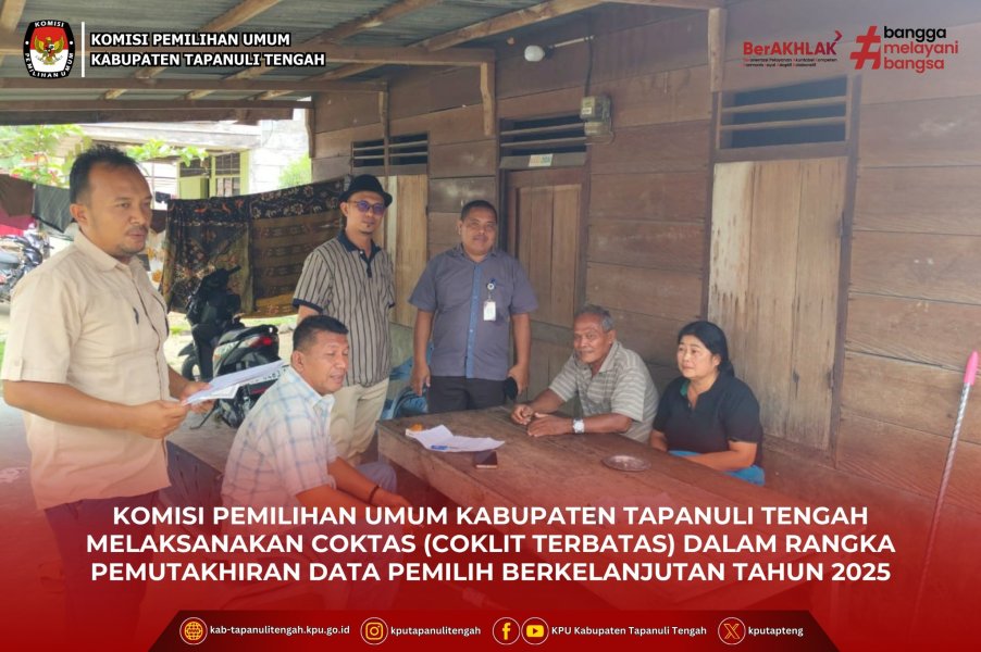 KPU Kabupaten Tapanuli Tengah melaksanakan kegiatan Coklit Terbatas (Coktas) sebagai bagian dari Pemutakhiran Data Pemilih Berkelanjutan (PDPB) di 12 (dua belas) kecamatan yang tersebar se - Kabupaten Tapanuli Tengah, 12 kecamatan tersebut yakni Kolang, Pasaribu Tobing, Sorkam, Sorkam Barat, Manduamas, Sirandorung, Sosorgadong, Pinang Sori, Sibabangun, Badiri, Tukka dan Pandan pada Sabtu (22/11/2025).