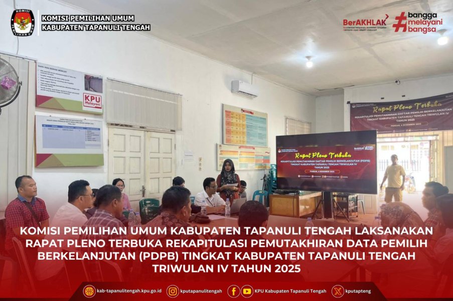 #TemanPemilih, KPU Kabupaten Tapanuli Tengah melaksanakan Rapat Pleno Terbuka Rekapitulasi Pemutakhiran Daftar Pemilih Berkelanjutan Triwulan IV Tahun 2025 di aula Kantor KPU Kabupaten Tapanuli Tengah, Sabtu (6/12/2025).
