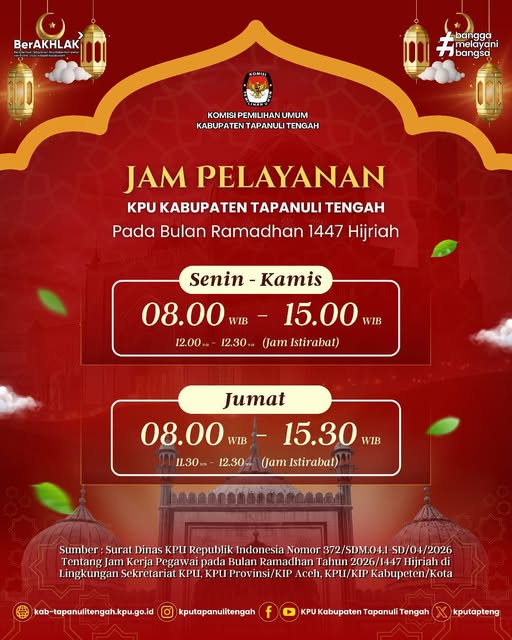 hai #Teman Pemilih, berikut jam pelayanan KPU Kabupaten Tapanuli Tengah pada bulan Ramadhan 1447 Hijriyah.