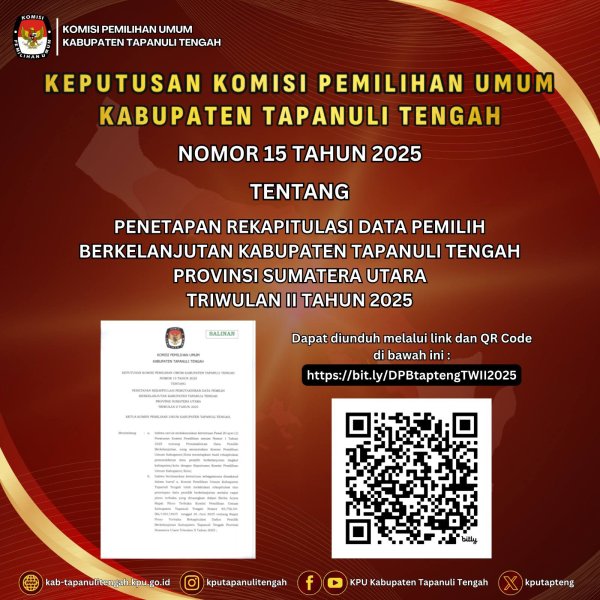 Berikut kami sampaikan surat keputusan Penetapan Rekapitulasi Data Pemilih Berkelanjutan Kabupaten Tapanuli Tengah Periode Triwulan II Tahun 2025