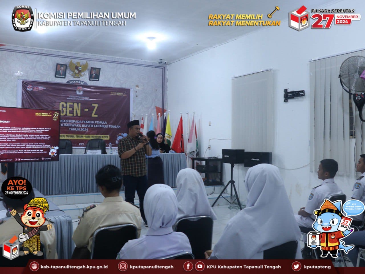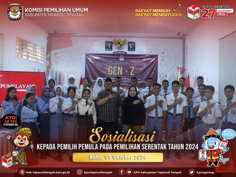 KPU kab. Tapanuli tengah melaksanakan sosialisasi kepada pemilih pemula pada Pemilihan Serentak Tahun 2024 dengan tema "Gen Z", bertempat di Aula Kantor KPU Kab. Tapanuli tengah, Rabu 9 Oktober 2024.