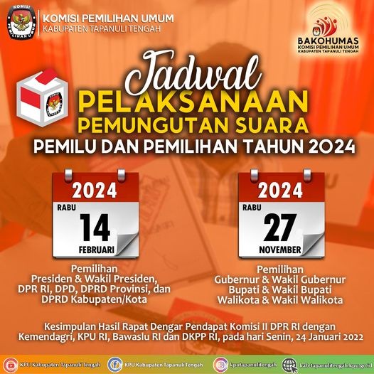 Pada Hari Rabu Tanggal 14 Februari 2024 untuk Pilpres , Pileg DPR RI, DPD RI, DRPD Prov dan Kab/Kota. Dan pada hari Rabu, Tanggal 27 November 2024 untuk Pilkada Pemilihan Gubernur & Wakil Gubernur, Bupati & Wakil Bupati, Walikota & Wakil Walikota.