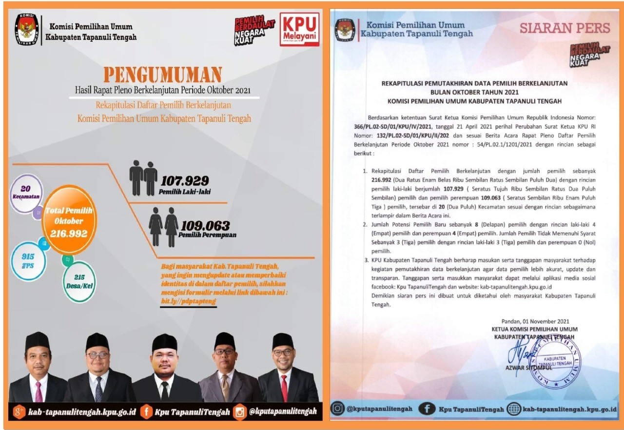 Kehadiran KPU Kabupaten Tapanuli Tengah diterima secara langsung oleh Kepala Dinas Kependudukan dan Pencatatan Sipil Kabupaten Tapanuli Tengah (Disdukcatpil), Sofia Juliasty Hutagalung didampingi Kabid Pendataan Informasi Administrasi Kependudukan, Tiarni Pasaribu, Kasi SIAK Anastasia Fedora Siahaan, pertemuan dilakukan di Kantor Dinas Kependudukan dan Pencatatan Sipil Kabupaten Tapanuli Tengah pada hari Senin, (1/11/2021). Hadir dari KPU Kabupaten Tapanuli Tengah yaitu Ketua KPU Tapteng Azwar Sitompul, didampingi Divisi Perencanaan, Data dan Informasi Jonas Bernard Pasaribu, Kasubbag Program & data Sudirman Silaen.