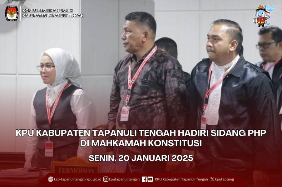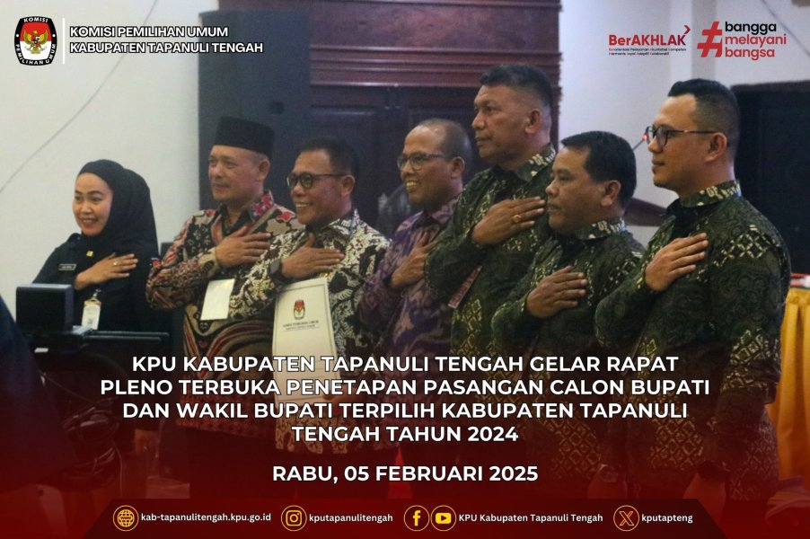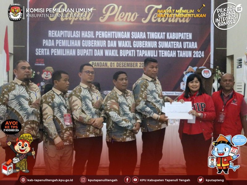 #TemanPemilih, KPU Kabupaten Tapanuli Tengah menggelar Rapat Pleno Terbuka Penetapan Pasangan Calon Bupati dan Wakil Bupati Terpilih Kabupaten Tapanuli Tengah Tahun 2024 di Ballroom PIA Hotel Pandan, Rabu (05/02/2025). Rapat pleno dibuka dan dipimpin oleh Ketua KPU Kabupaten Tapanuli Tengah Wahid Pasaribu didampingi Anggota KPU Kabupaten Tapanuli Tengah Helman Tambunan dan Abdul Haris Nasution serta Sekretaris KPU Kabupaten Tapanuli Tengah Juliana Hutasuhut. KPU Kabupaten Tapanuli Tengah menetapkan Pasangan Calon Masinton Pasaribu dan Mahmud Efendi sebagai Pasangan Calon Bupati dan Wakil Bupati Terpilih dengan total perolehan suara 87.095 atau 54% dari total seluruh suara sah melalui Keputusan KPU Kabupaten Tapanuli Tengah Nomor 7 Tahun 2025 tentang Penetapan PasanganBupati dan Wakil Bupati Terpilih Kabupaten Tapanuli Tengah Tahun 2024. Dihadiri langsung oleh Pasangan Calon Bupati dan Wakil Bupati Terpilih , Pj. Bupati Tapanuli Tengah, Pimpinan Partai Politik Pengusul Pasangan Calon Bupati dan Wakil Bupati Tapanuli Tengah, Ketua dan Anggota Bawaslu Kabupaten Tapanuli Tengah yang di wakili oleh sekretariat Bawaslu, serta unsur Forkopimda Kabupaten Tapanuli Tengah. #KPUMelayani #PilkadaSerentak2024