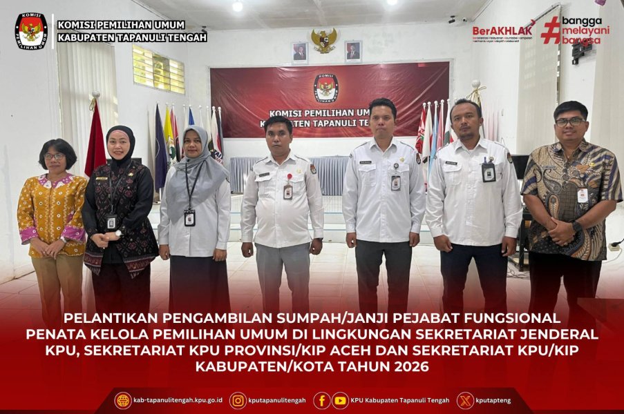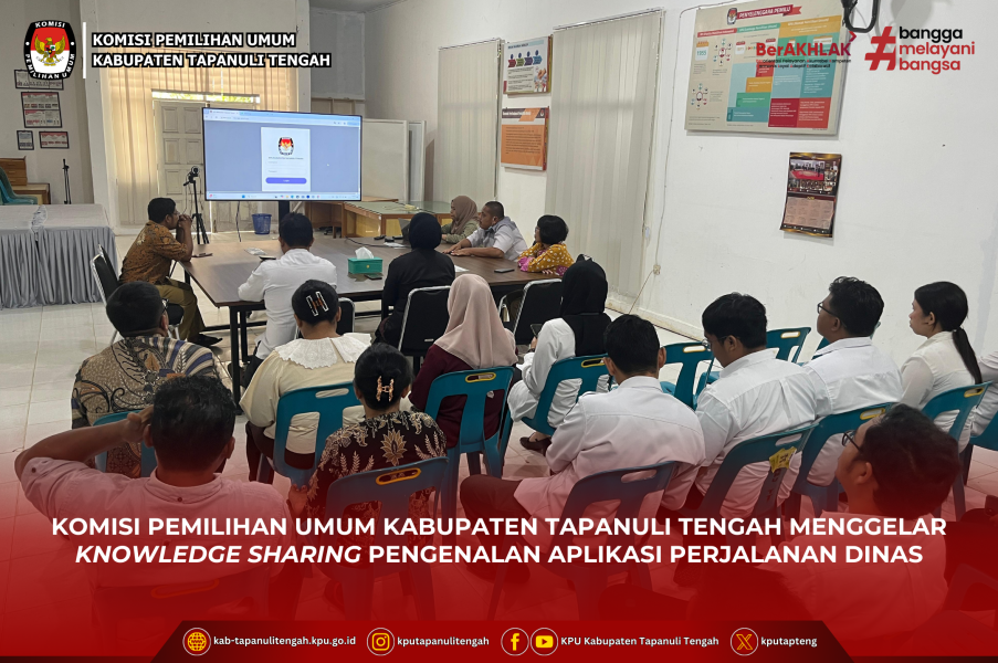 Komisi Pemilihan Umum (KPU) Kabupaten Tapanuli Tengah menggelar kegiatan knowledge sharing pengenalan aplikasi perjalanan dinas, Kamis (22/1/2026), di Aula Kantor KPU Kabupaten Tapanuli Tengah.