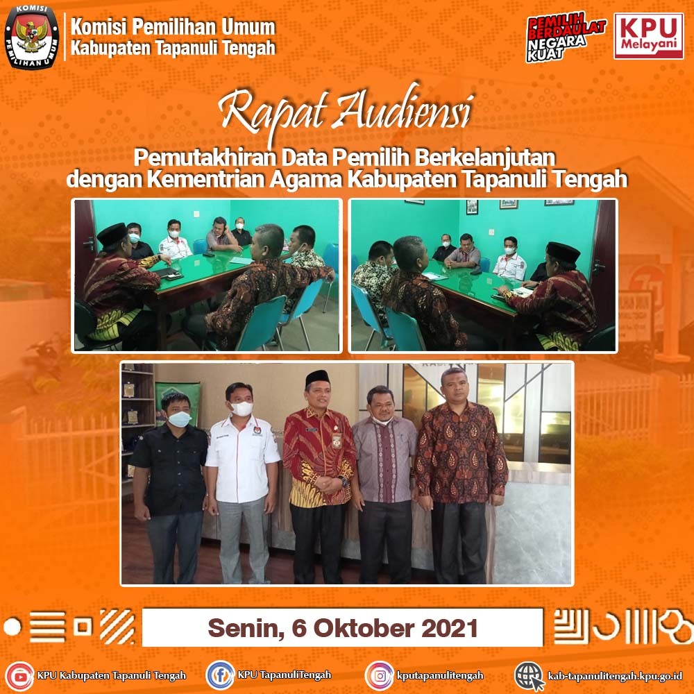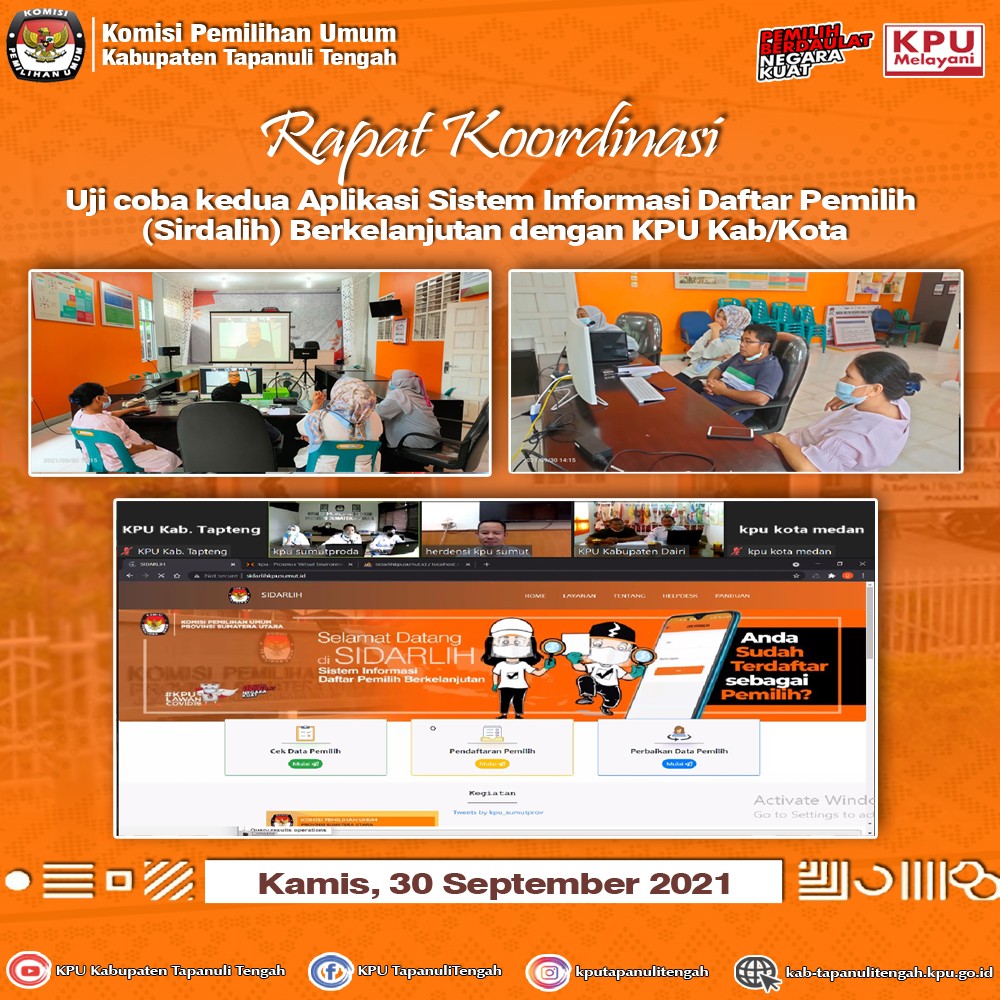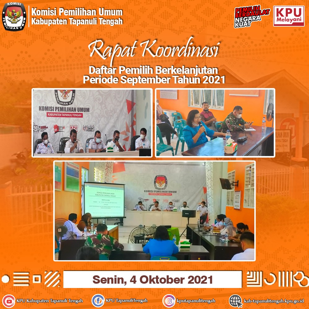 KPU Kabupaten Tapanuli Tengah melaksanakan Rapat Koordinasi Rekapitulasi Daftar Pemilih Berkelanjutan di tingkat Kabupaten Tapanuli Tengah periode September Tahun 2021 pada Senin, 4 Oktober 2021 yang bertempat di Aula Rumah Pintar Pemilu, KPU Kabupaten Tapanuli Tengah.