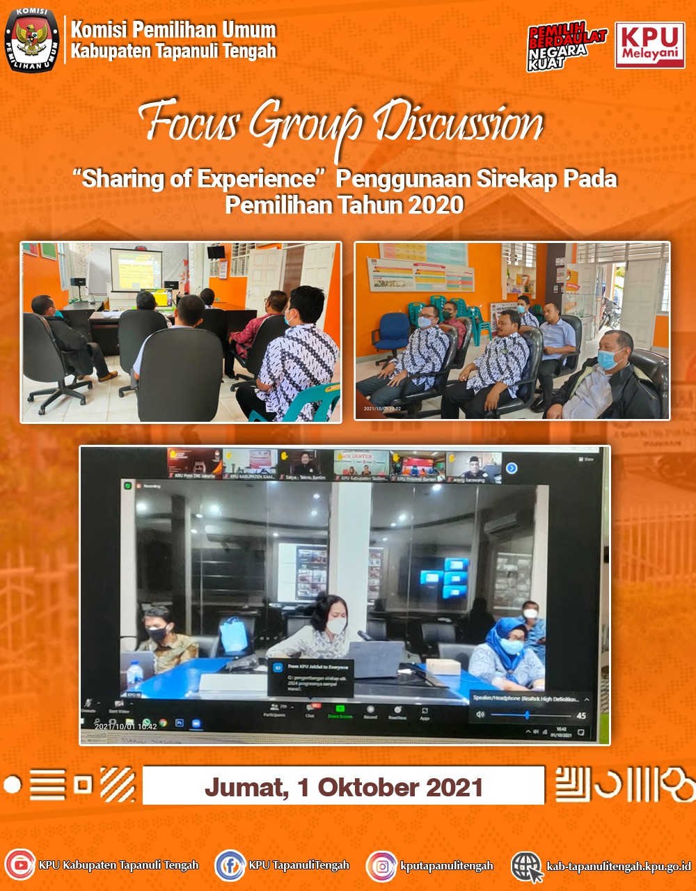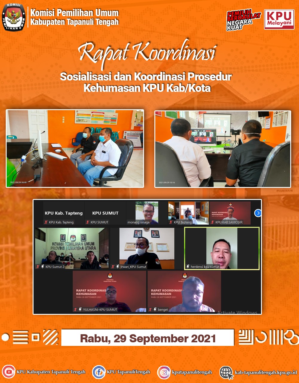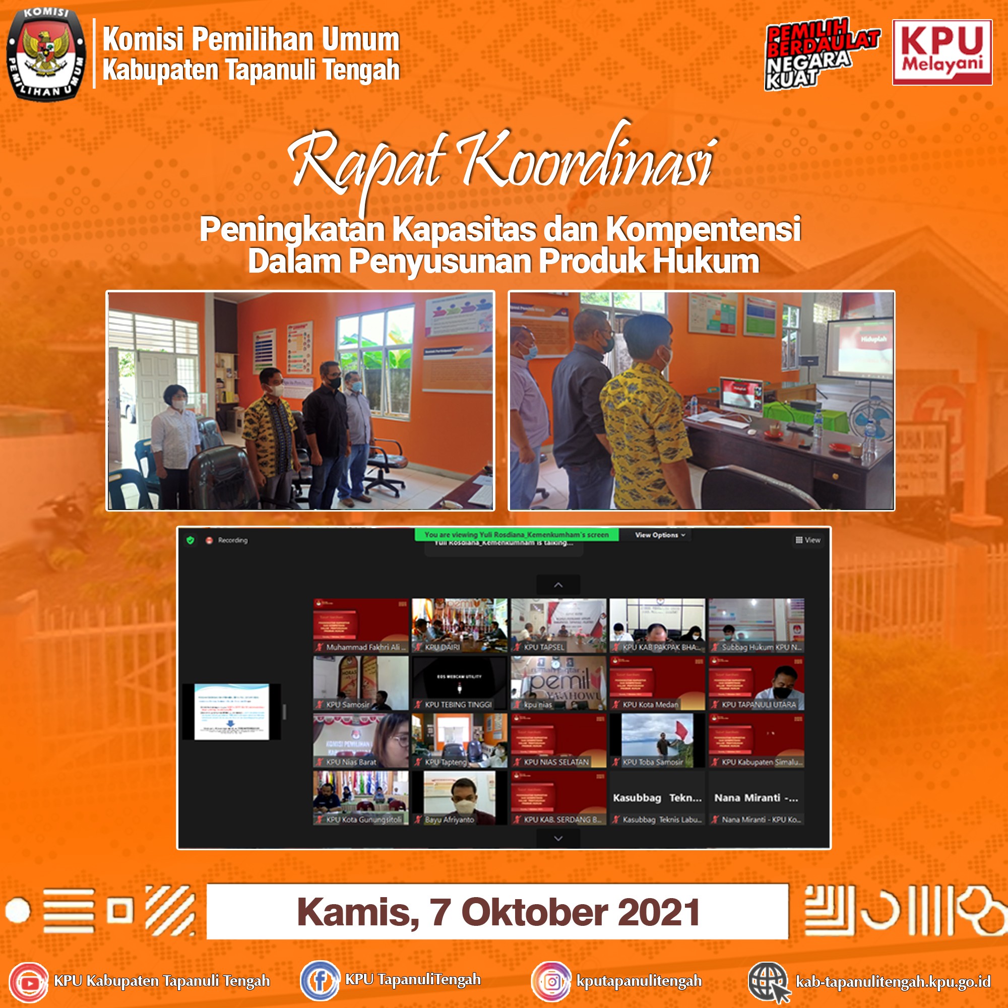 KPU Kabupaten Tapanuli Tengah melaksanakan Rapat Koordinasi Rekapitulasi Daftar Pemilih Berkelanjutan di tingkat Kabupaten Tapanuli Tengah periode September Tahun 2021 pada Senin, 4 Oktober 2021 yang bertempat di Aula Rumah Pintar Pemilu, KPU Kabupaten Tapanuli Tengah.