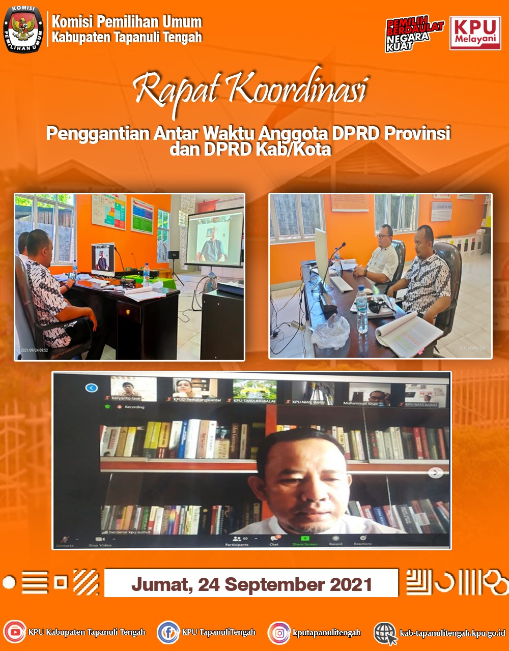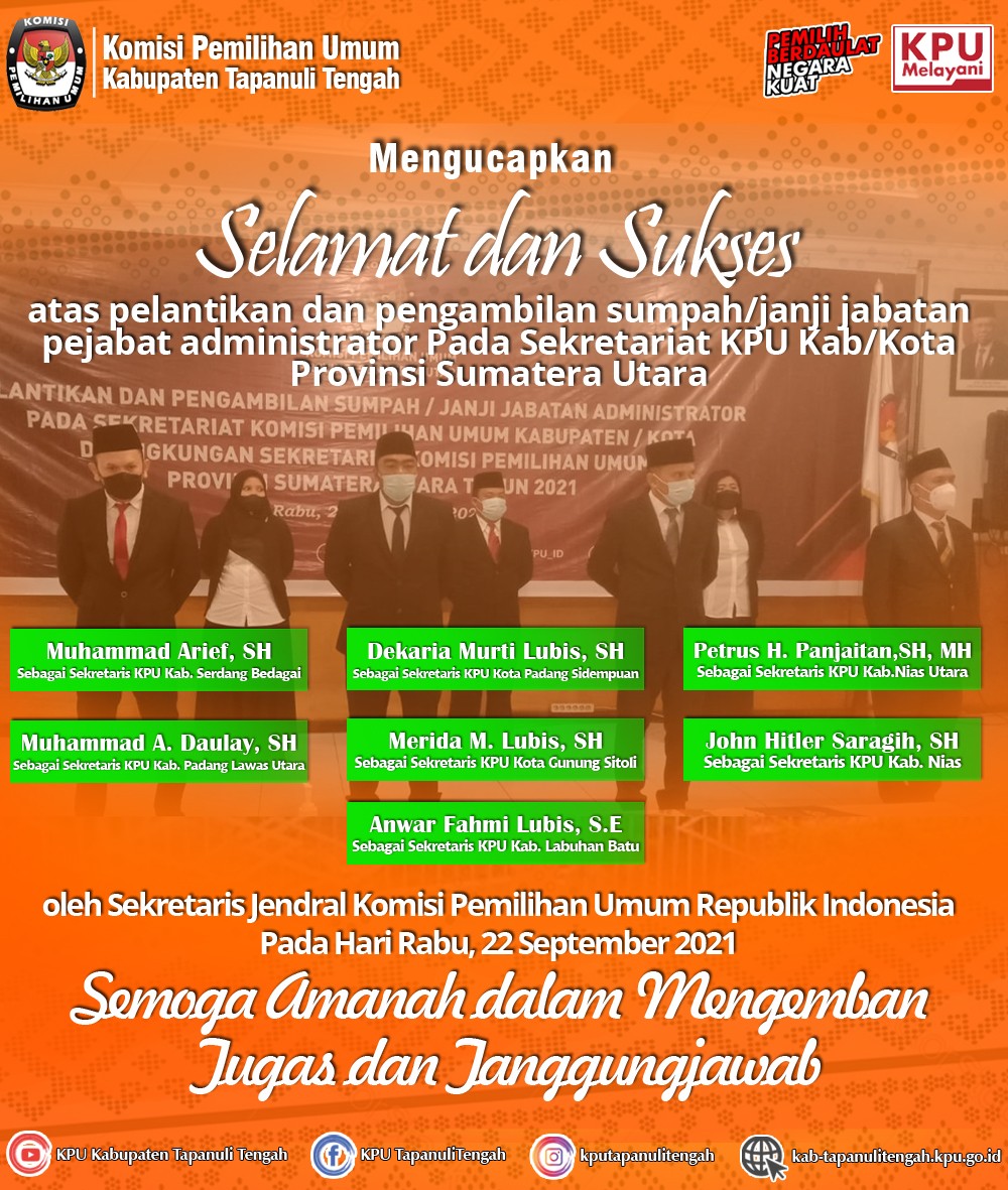 Keluarga besar KPU Kab. Tapanuli Tengah mengucapkan selamat dan sukses atas pelantikan sumpah/janji jabatan pejabat administrator pada Sekretariat KPU Kab/Kota Provinsi Sumatera Utara: