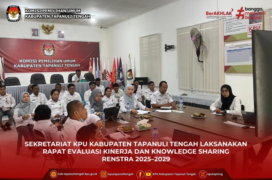 Sekretariat Komisi Pemilihan Umum (KPU) Kabupaten Tapanuli Tengah menyelenggarakan Rapat Evaluasi Kinerja Sekretariat dan Knowledge Sharing Rencana Strategis (Renstra) Komisi Pemilihan Umum Tahun 2025–2029, pada Senin, (19/01/2026), bertempat di Aula KPU Kabupaten Tapanuli Tengah.