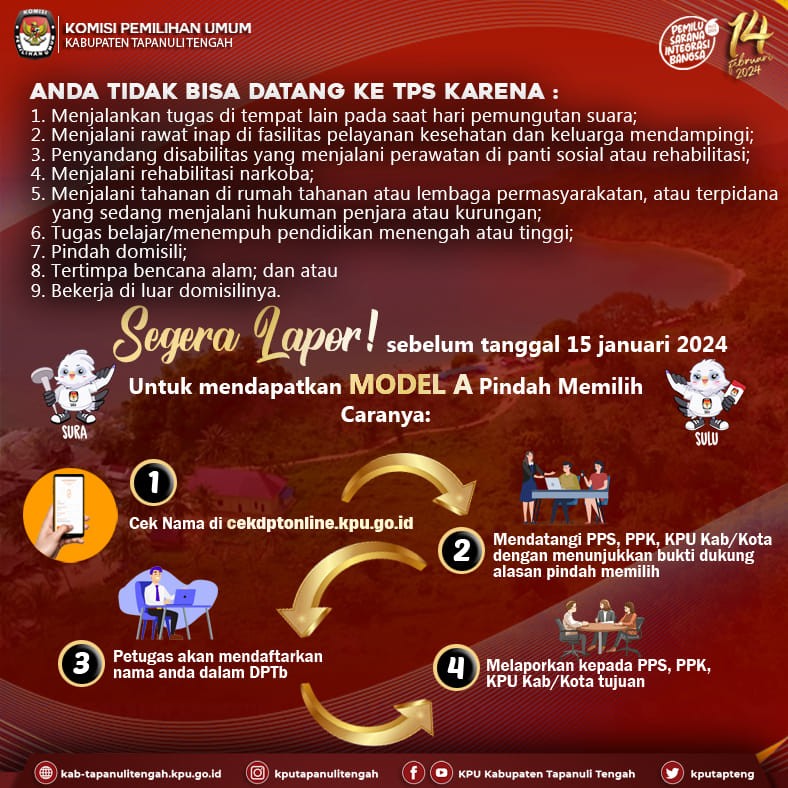 Jika kamu pada saat hari pemungutan suara tanggal 14 Februari 2024, dalam kondisi : 1. menjalankan tugas di tempat lain pada saat hari pemungutan suara; 2. menjalani rawat inap di fasilitas pelayanan kesehatan dan keluarga mendampingi; 3. penyandang disabilitas yang menjalani perawatan di panti sosial atau rehabilitasi; 4. menjalani rehabilitasi narkoba; 5. menjadi tahanan di rumah tahanan atau lembaga pemasyarakatan, atau terpidana yang sedang menjalani hukuman penjara atau kurungan; 6. tugas belajar/menempuh pendidikan menengah atau tinggi; 7. pindah domisili; 8. tertimpa bencana alam; dan/atau 9. bekerja di luar domisilinya Segera hubungi ke PPS atau PPK terdekat atau contact person posko layanan pindah pemilih KPU Kabupaten Tapanuli Tengah: 082165893439 untuk didaftarkan ke dalam DPTB atau Daftar Pemilih Tambahan. Tentunya untuk proses pindah memilih ini siapkan juga dokumen kamu: 1. Fotokopi KTP 2. Fotokopi KK 3. Bukti Dukung sesuai dengan alasan pindah memilih. Jangan lupa, Rabu 14 Februari 2024 datang ke TPS Gunakan hak pilihmu