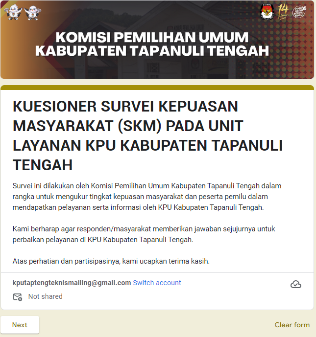 Kami berharap agar responden/masyarakat memberikan jawaban sejujurnya untuk perbaikan pelayanan di KPU Kabupaten Tapanuli Tengah.