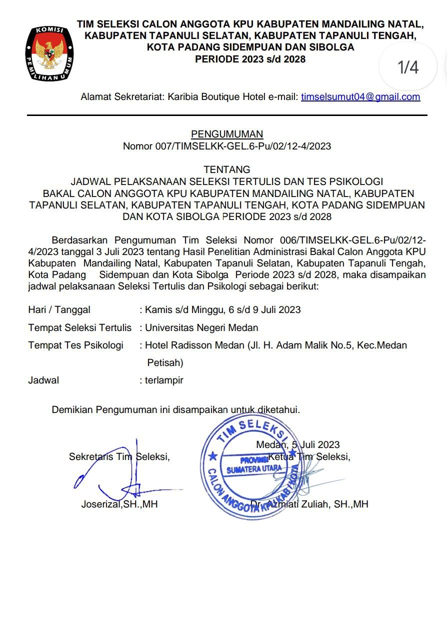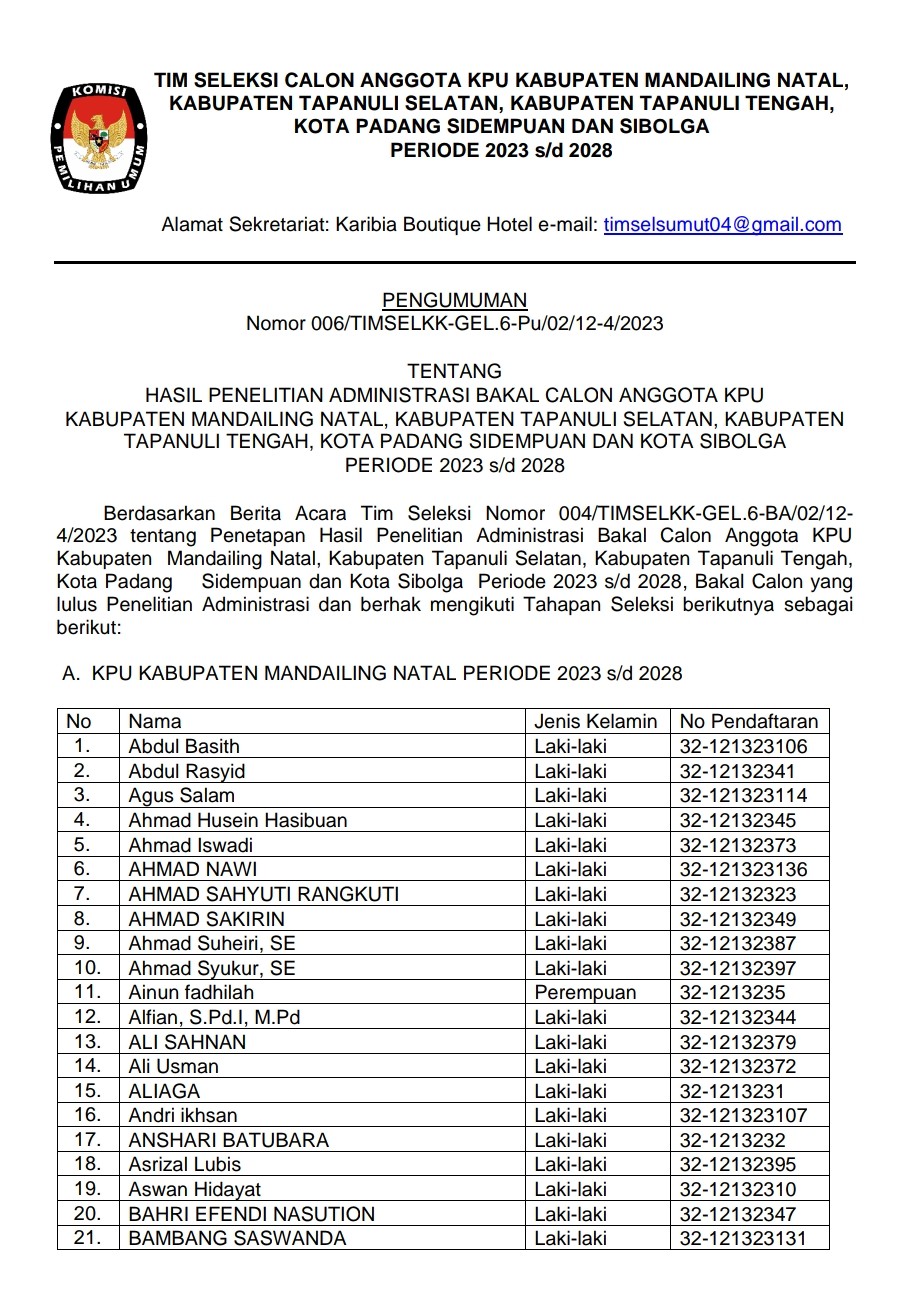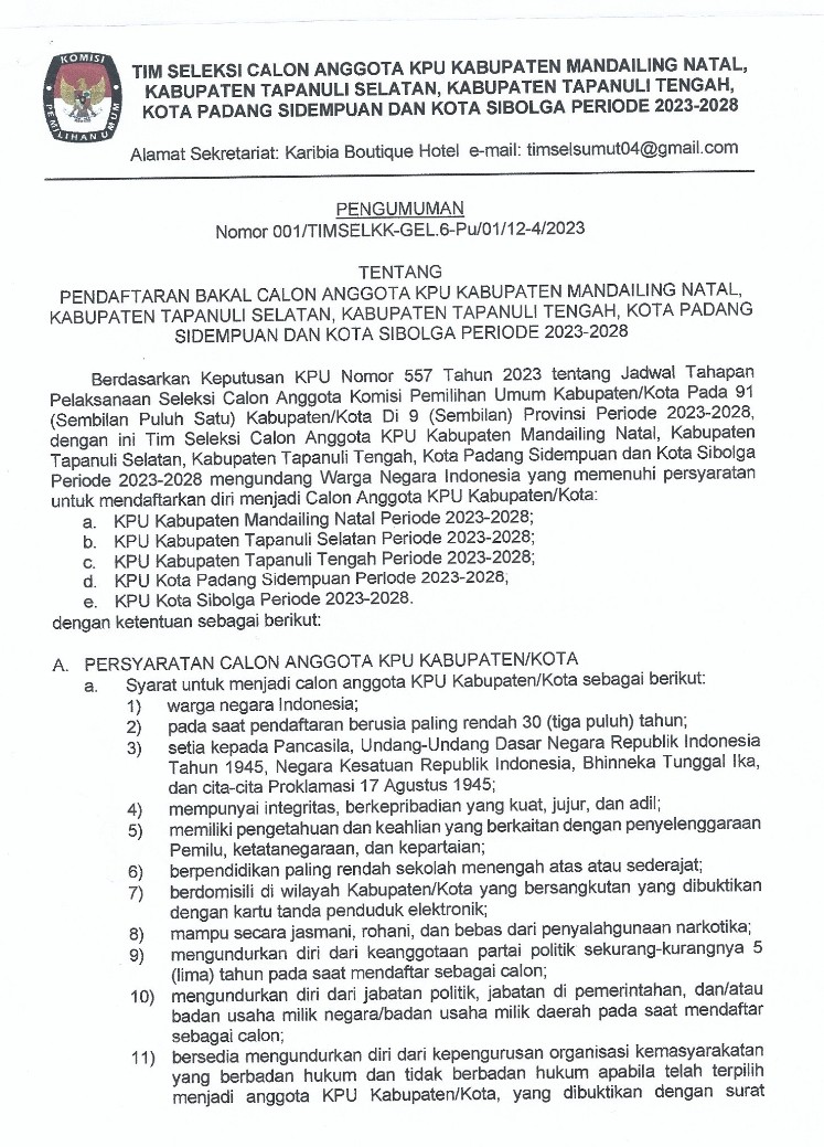 Berikut Pengumuman Nomor: 001/TIMSELKK-GEL.6-Pu/01/12-4/2023 Tentang Pendaftaran Bakal Calon Anggota KPU Kabupaten Mandailing Natal, Kabupaten Tapanuli Selatan, Kabupaten Tapanuli Tengah, Kota Padang Sidempuan, dan Kota Sibolga Periode 2023 - 2028