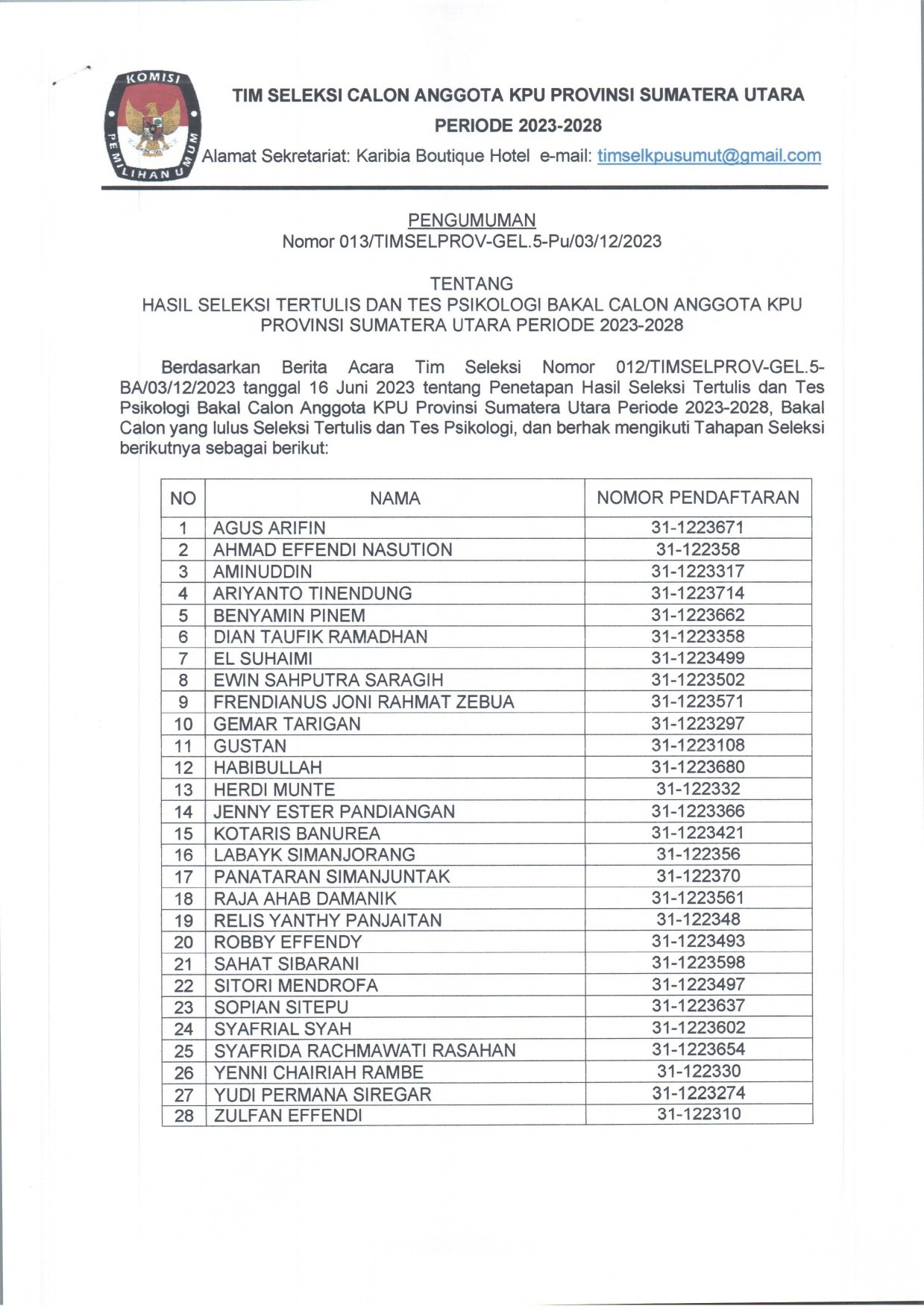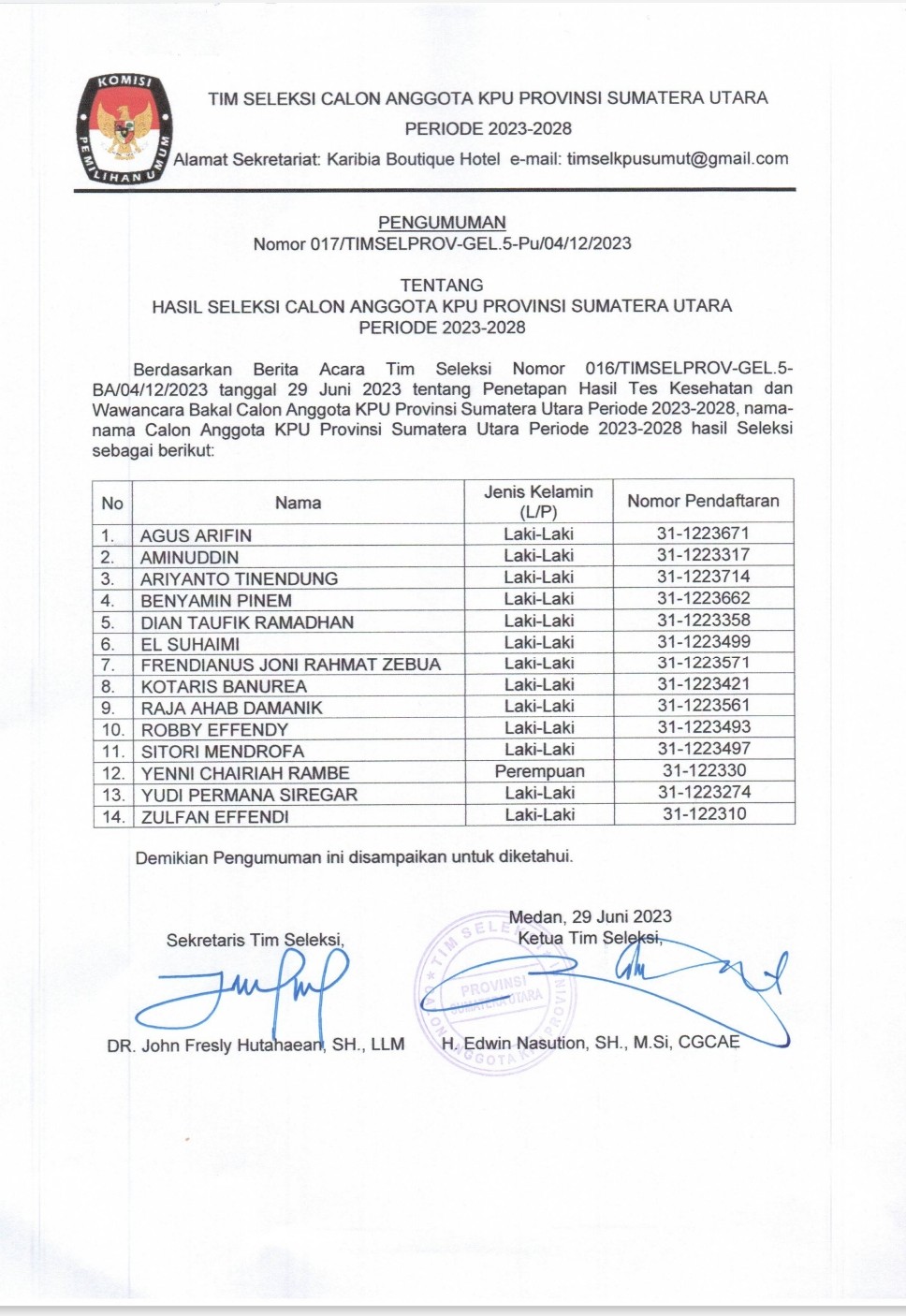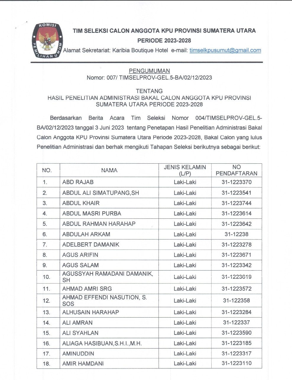 Berikut Pengumuman Nomor: 001/TIMSELKK-GEL.6-Pu/01/12-4/2023 Tentang Pendaftaran Bakal Calon Anggota KPU Kabupaten Mandailing Natal, Kabupaten Tapanuli Selatan, Kabupaten Tapanuli Tengah, Kota Padang Sidempuan, dan Kota Sibolga Periode 2023 - 2028