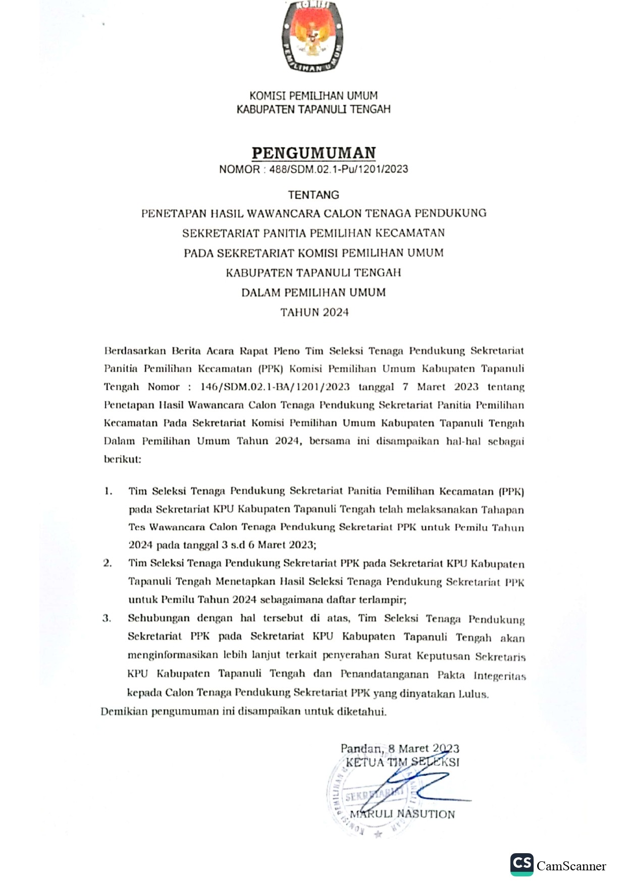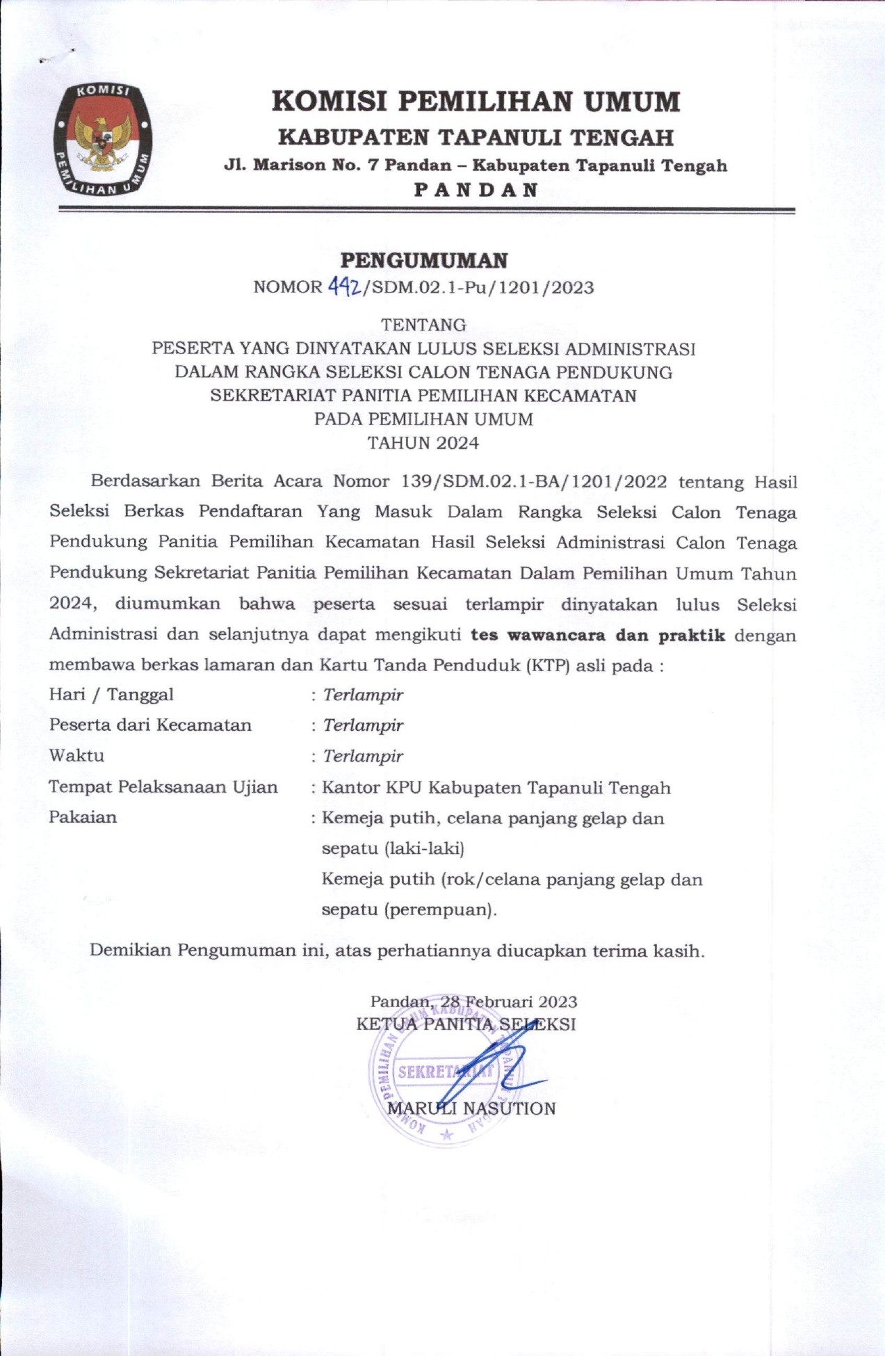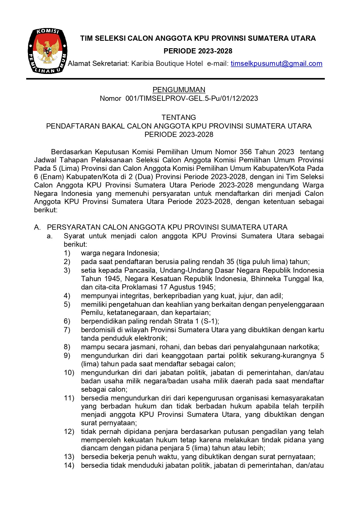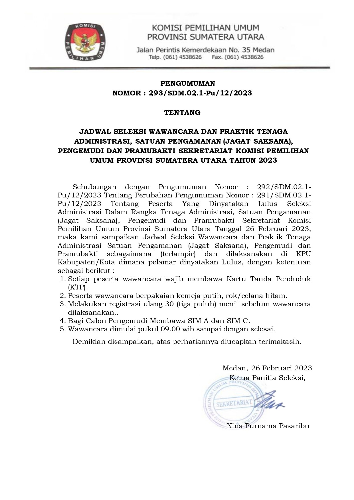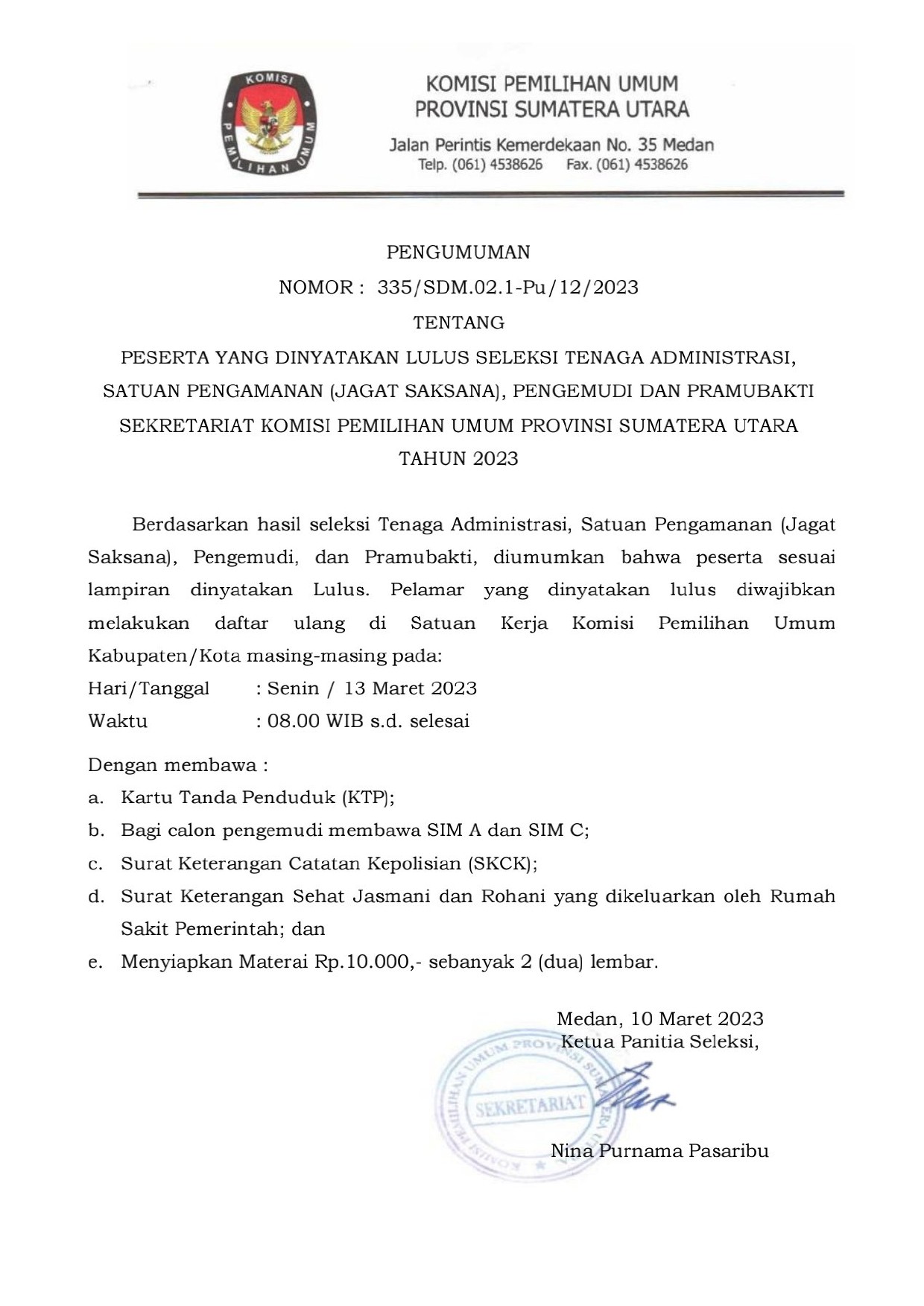 Berikut ini disampaikan Pengumuman KPU Prov. Sumut Nomor : 355/SDM.02.1-Pu/1201/2023 tentang PESERTA YANG DINYATAKAN LULUS SELEKSI TENAGA ADMINISTRASI, SATUAN PENGAMANAN (JAGAT SAKSANA), PENGEMUDI DAN PRAMUBAKTI SEKRETARIAT KOMISI PEMILIHAN UMUM PROVINSI SUMATERA UTARA TAHUN 2023