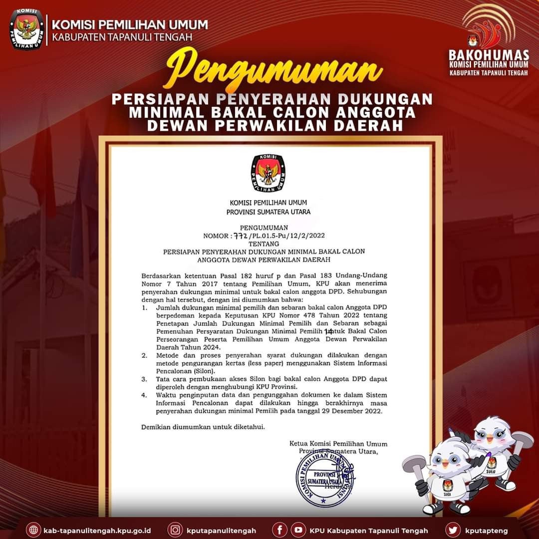 Untuk memberikan informasi secara luas kepada masyarakat, bersama ini KPU Provinsi Sumatera Utara telah membuka layanan informasi bagi masyarakat yang berkeinginan menjadi Calon Anggota Dewan Perwakilan Daerah (DPD) pada Pemilihan Umum Tahun 2024.