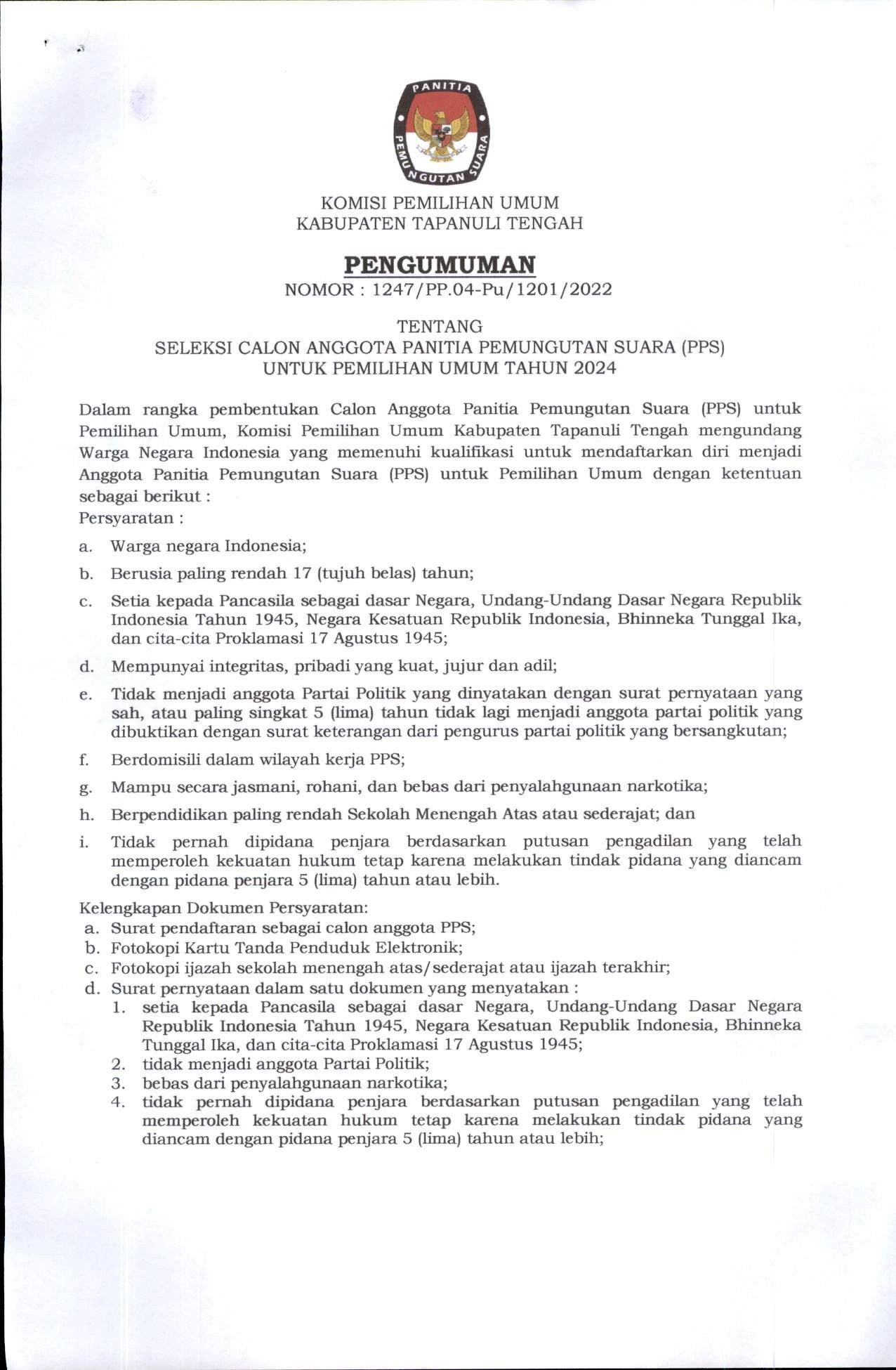Berikut Pengumuman Hasil Penelitian Seleksi Administrasi Calon Panitia Pemungutan Suara (PPS) Kabupaten Tapanuli Tengah.