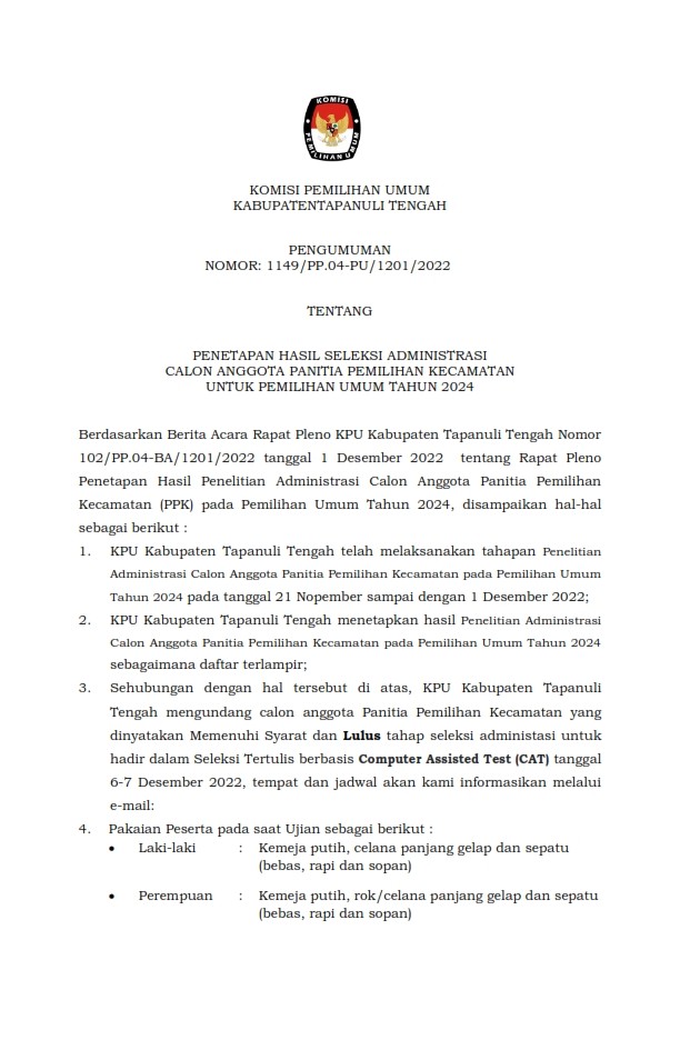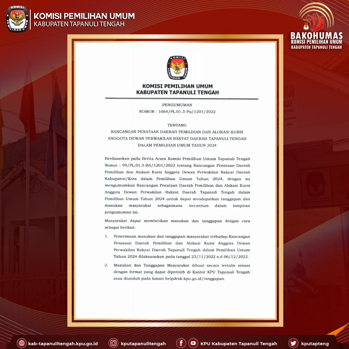 Berikut ini kami sampaikan Pengumuman KPU Kabupaten Tapanuli Tengah Nomor: 1064/PL.01.3-Pu/1201/2022 Tentang Rancangan Penataan Daerah Pemilihan dan Alokasi Kursi Anggota Dewan Perwakilan Rakyat Daerah Tapanuli Tengah Dalam Pemilihan Umum Tahun 2024.