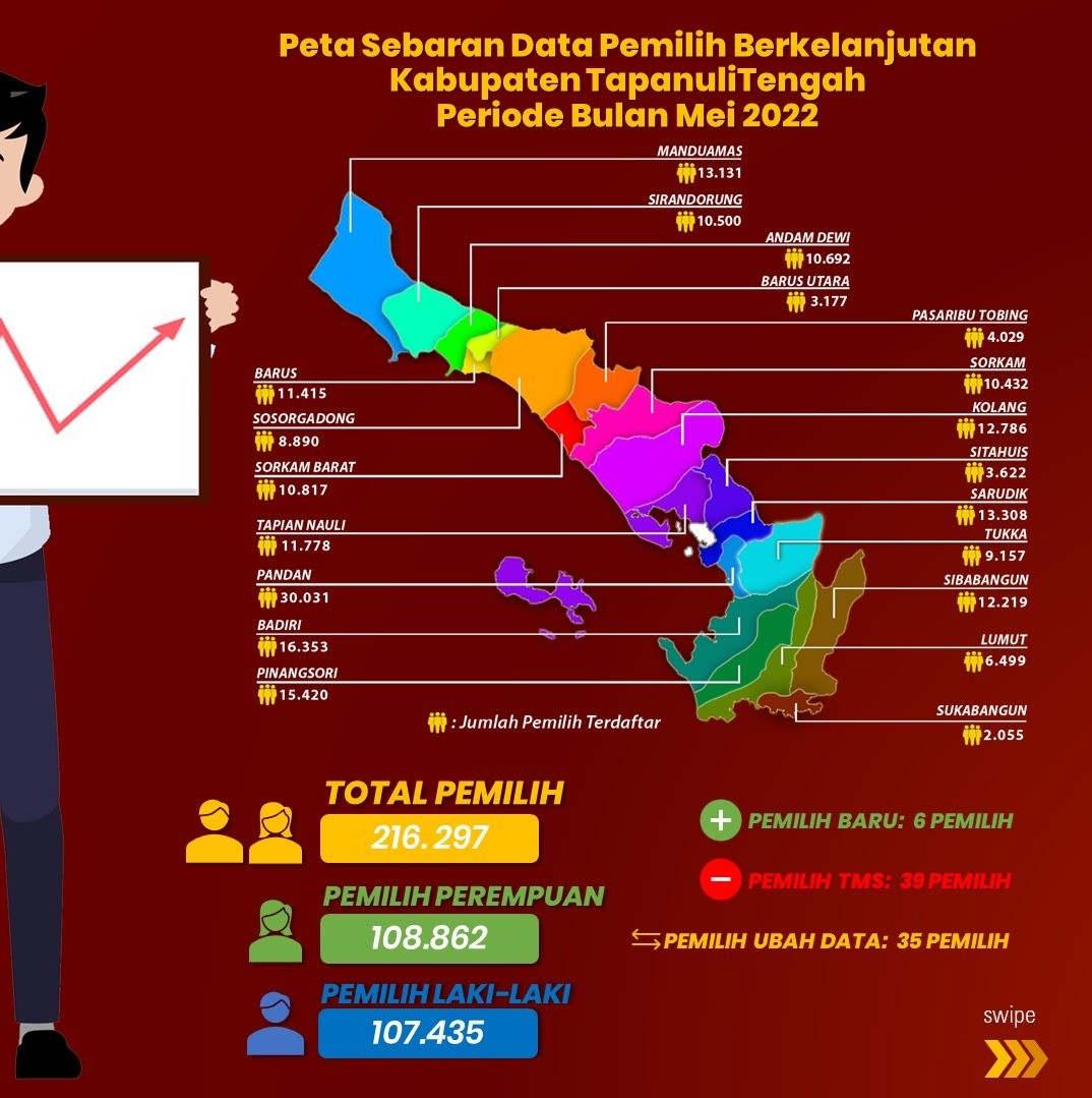 1. Rekapitulasi Daftar Pemilih Berkelanjutan dengan jumlah pemilih sebanyak 215.264 pemilih dengan pemilih laki-laki berjumlah 106.898 dan jumlah pemilih perempuan 108.366 pemilih yang tersebar di 20 kecamatan;