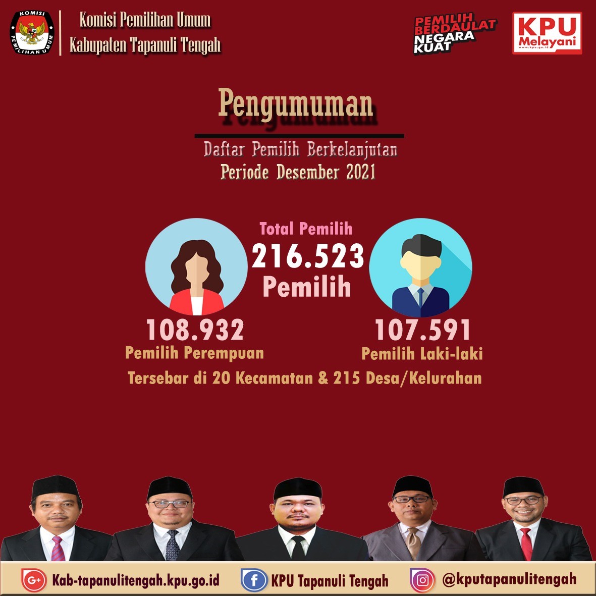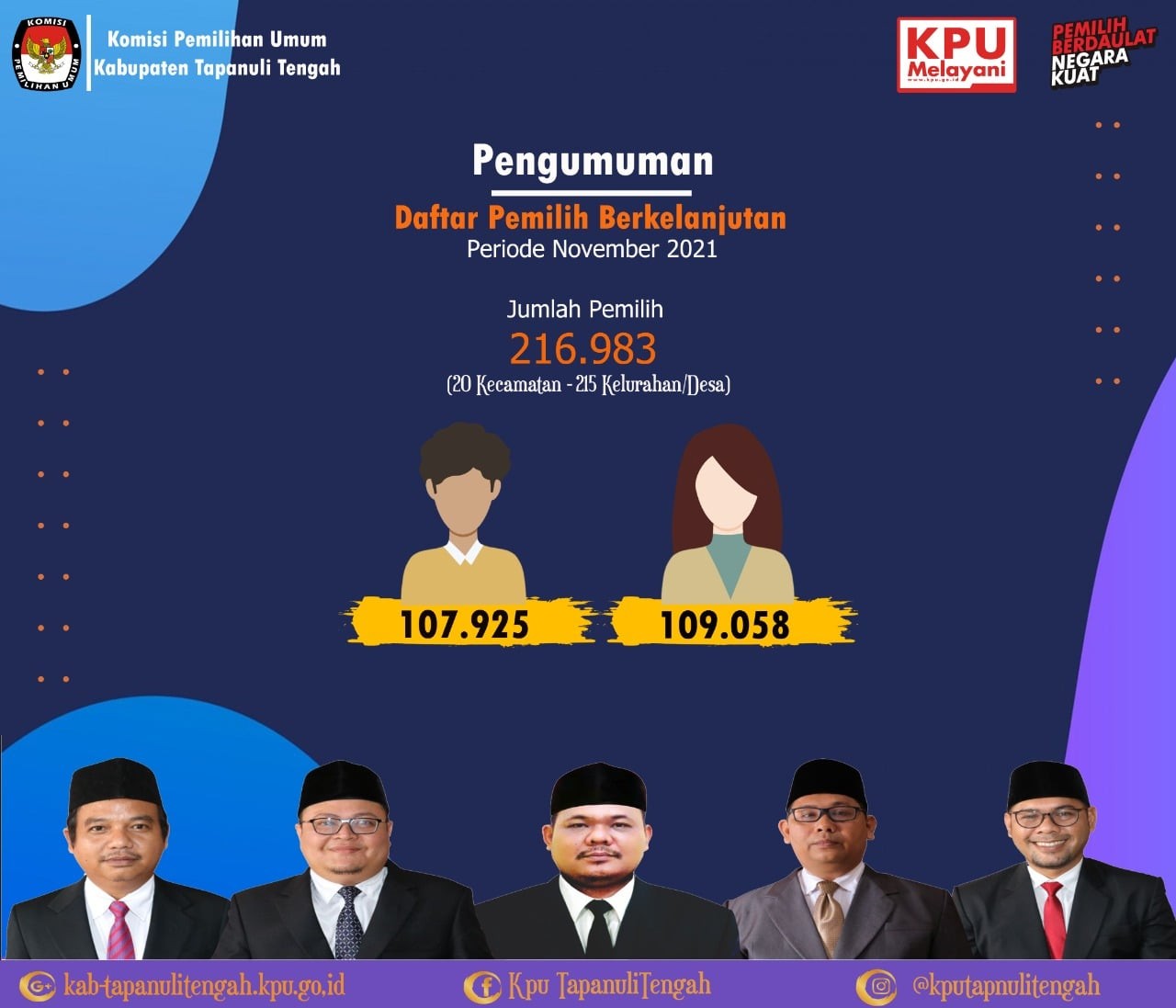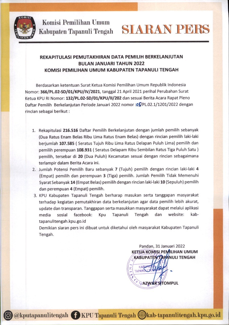 KPU Kabupaten Tapanuli Tengah menyampaikan Siaran Pers dan Pengumuman Rekapitulasi Daftar Pemilih Berkelanjutan Periode November Tahun 2021 sesuai hasil Rapat Pleno Daftar Pemilih Berkelanjutan Periode November Tahun 2021 yang tertuang dengan rincian: