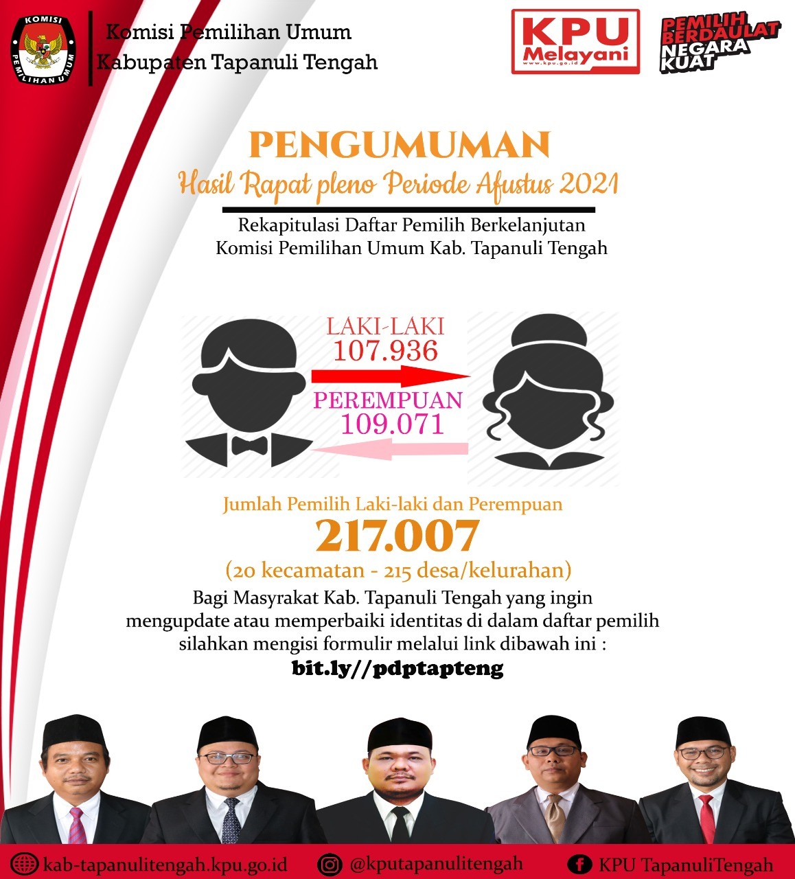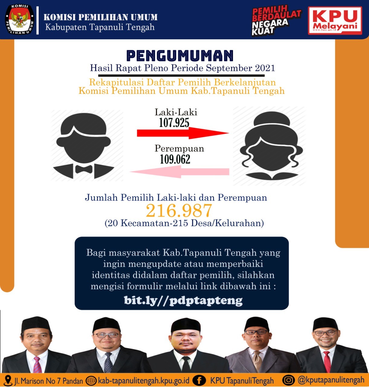 Berikut ini adalah infografis rekapitulasi daftar pemilih berkelanjutan Kabupaten Tapanuli Tengah pada periode September Tahun 2021 dengan jumlah pemilih dari 20 kecamatan (215 kelurahan/desa) sebanyak 216.987 pemilih. Pemilih laki-laki berjumlah 107.925 pemilih, pemilih perempuan 109.062 pemilih, pemilih baru berjumlah 2 pemilih, dan data TMS (Tidak Memenuhi Syarat) sebanyak 22 pemilih.