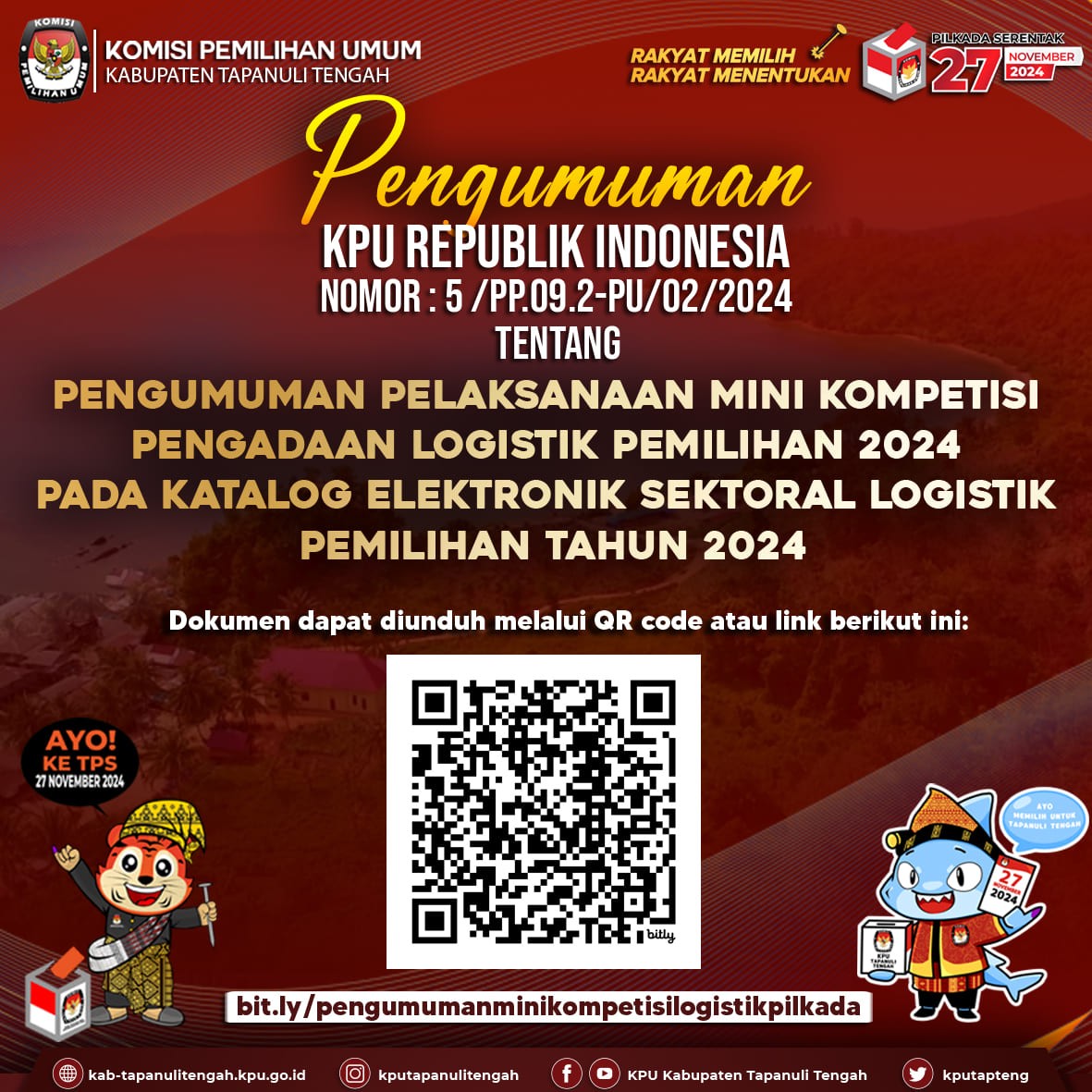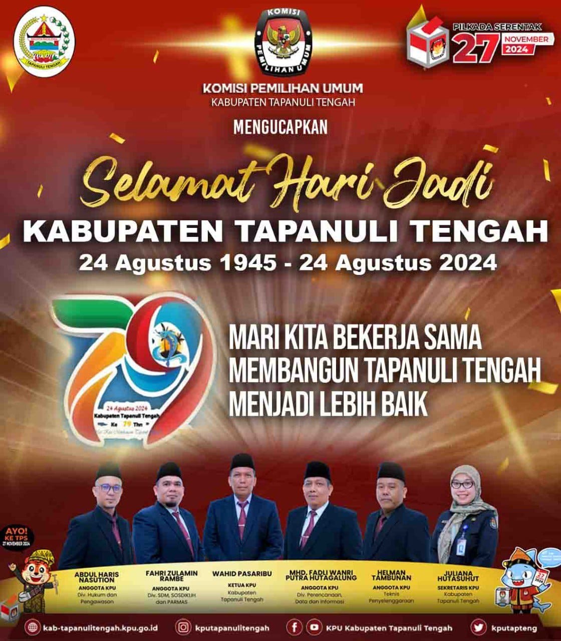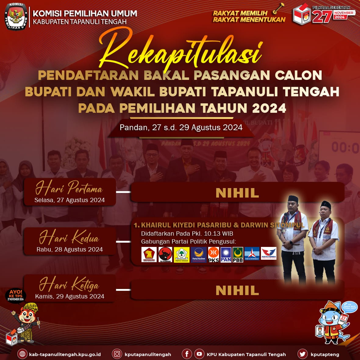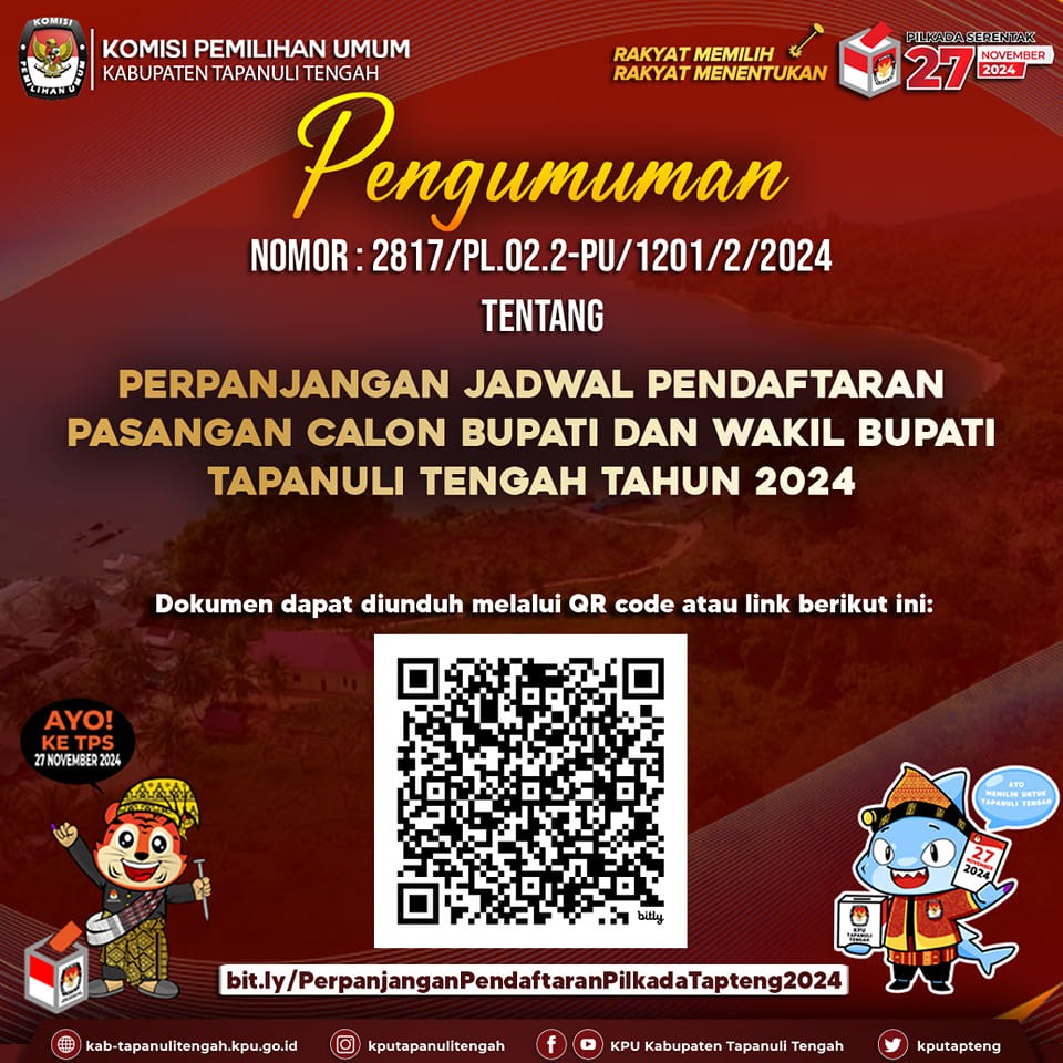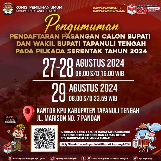 #TemanPemilih, KPU Kabupaten Tapanuli Tengah resmi membuka Pendaftaran Bakal Pasangan Cakon Bupati dan Wakil Bupati Kabupaten Tapanuli Tengah Pada Pemilihan Serentak Tahun 2024.
