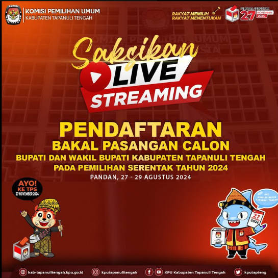 Kegiatan ini juga dapat disaksikan melalui live streaming youtbe KPU Kabupaten Tapanuli Tengah yang dimulai Pukul 08.00 WIB bertempat di aula kantor KPU Kabupaten Tapanuli Tengah, Selasa (27/08/24)
