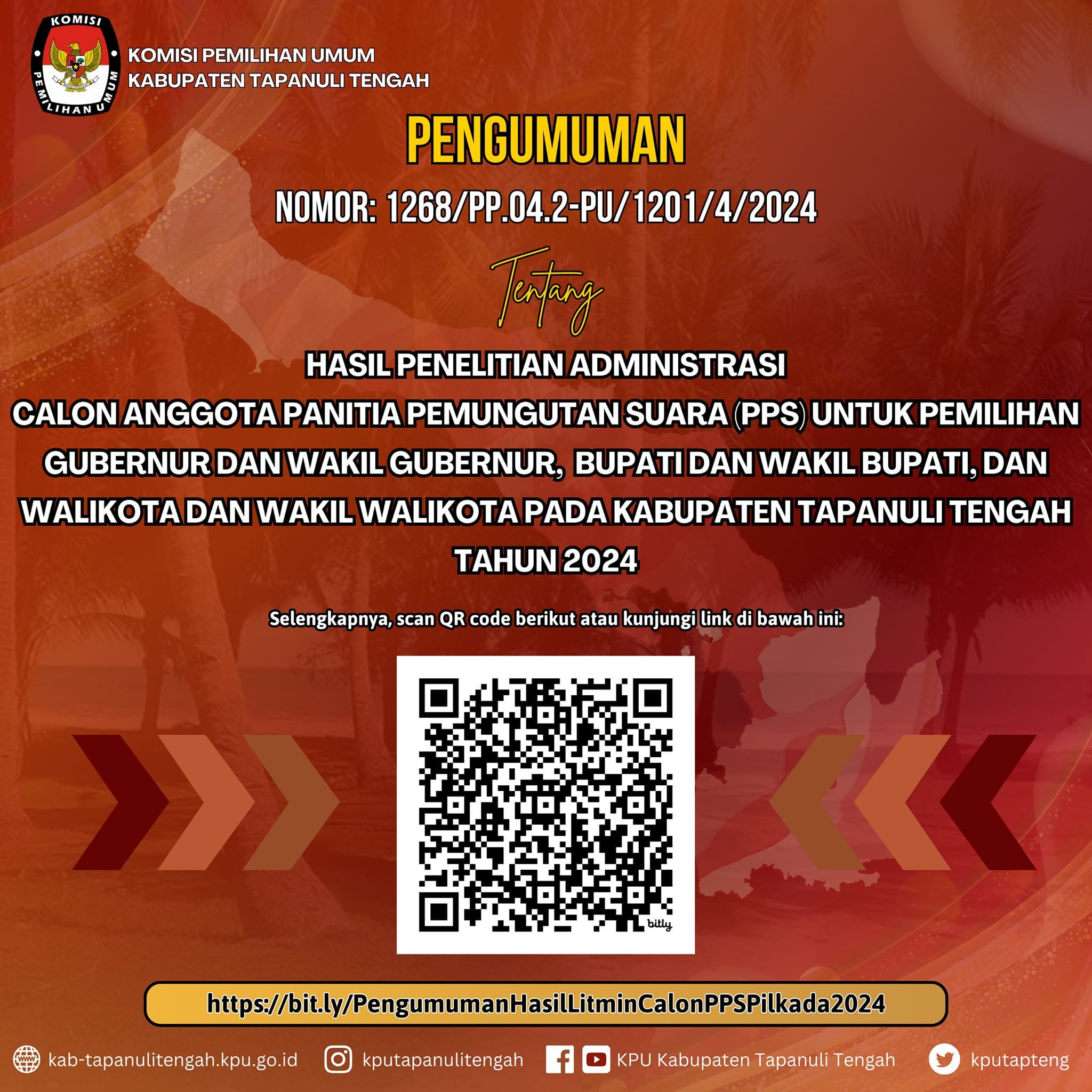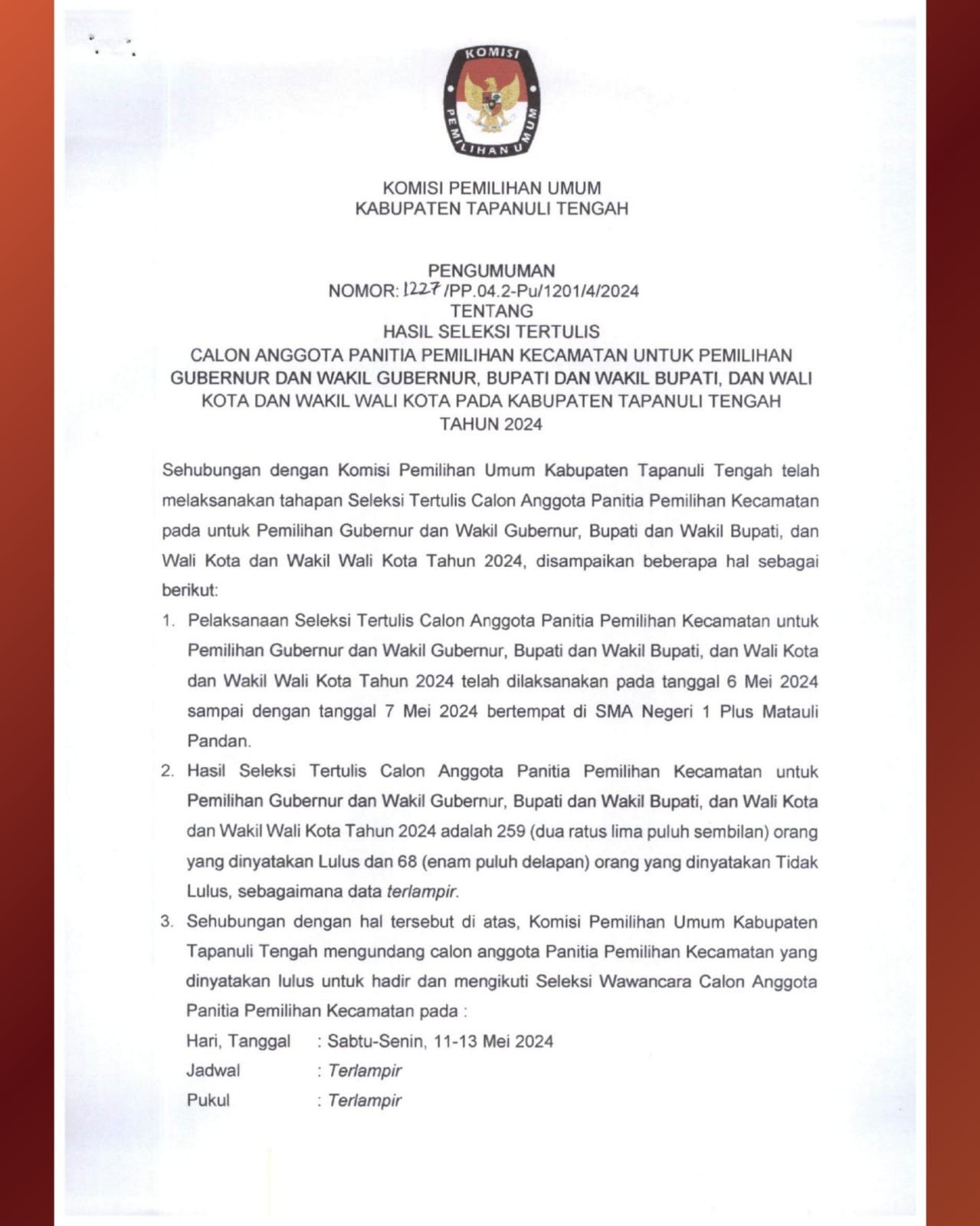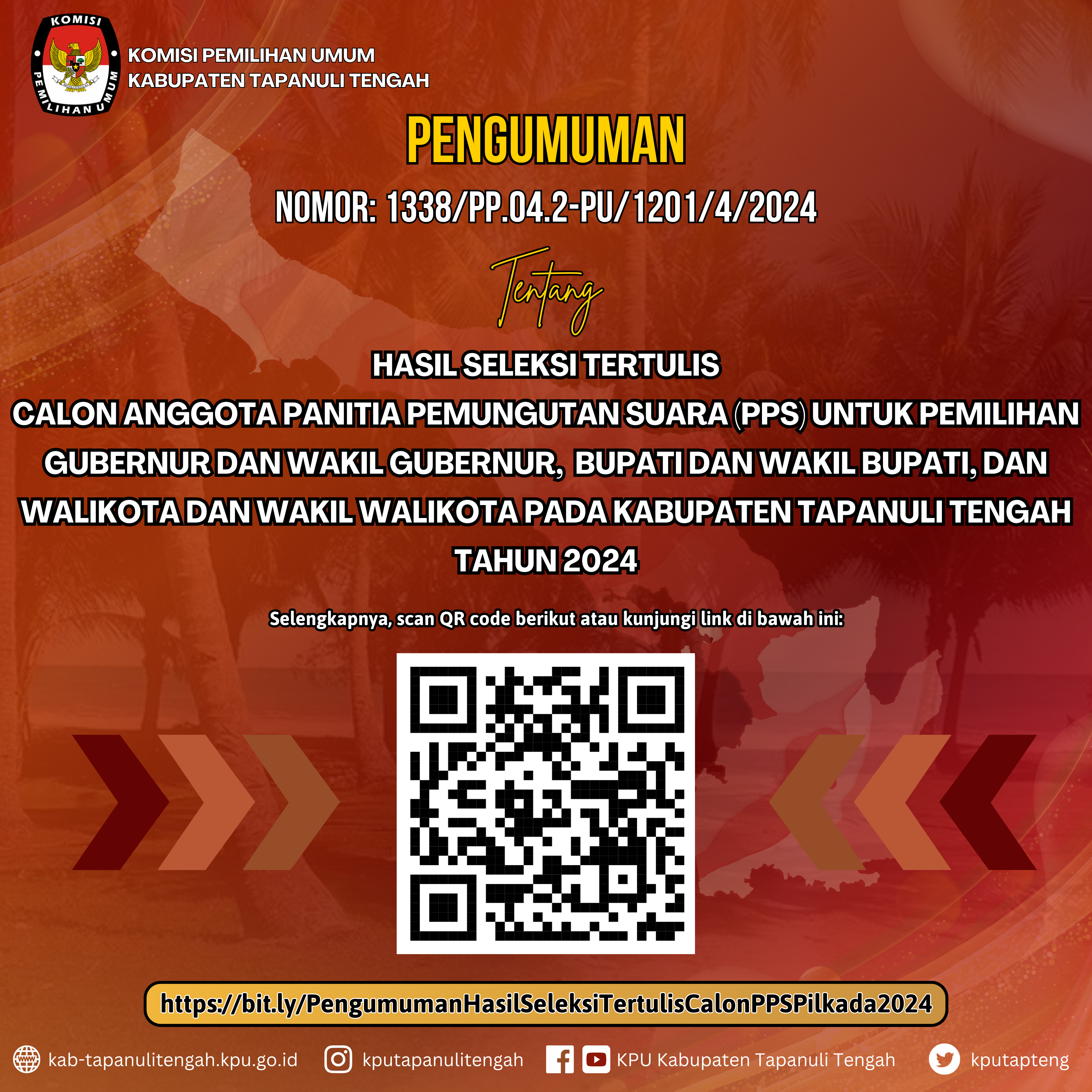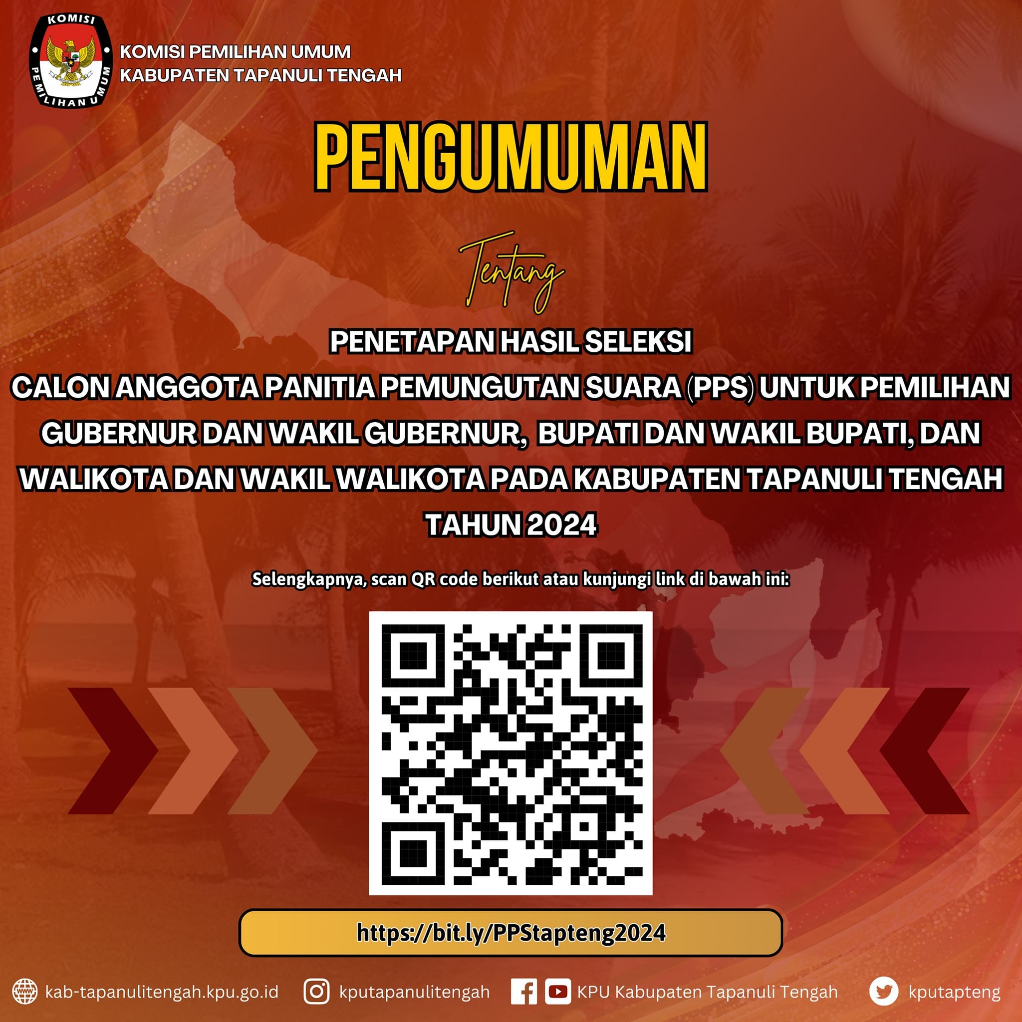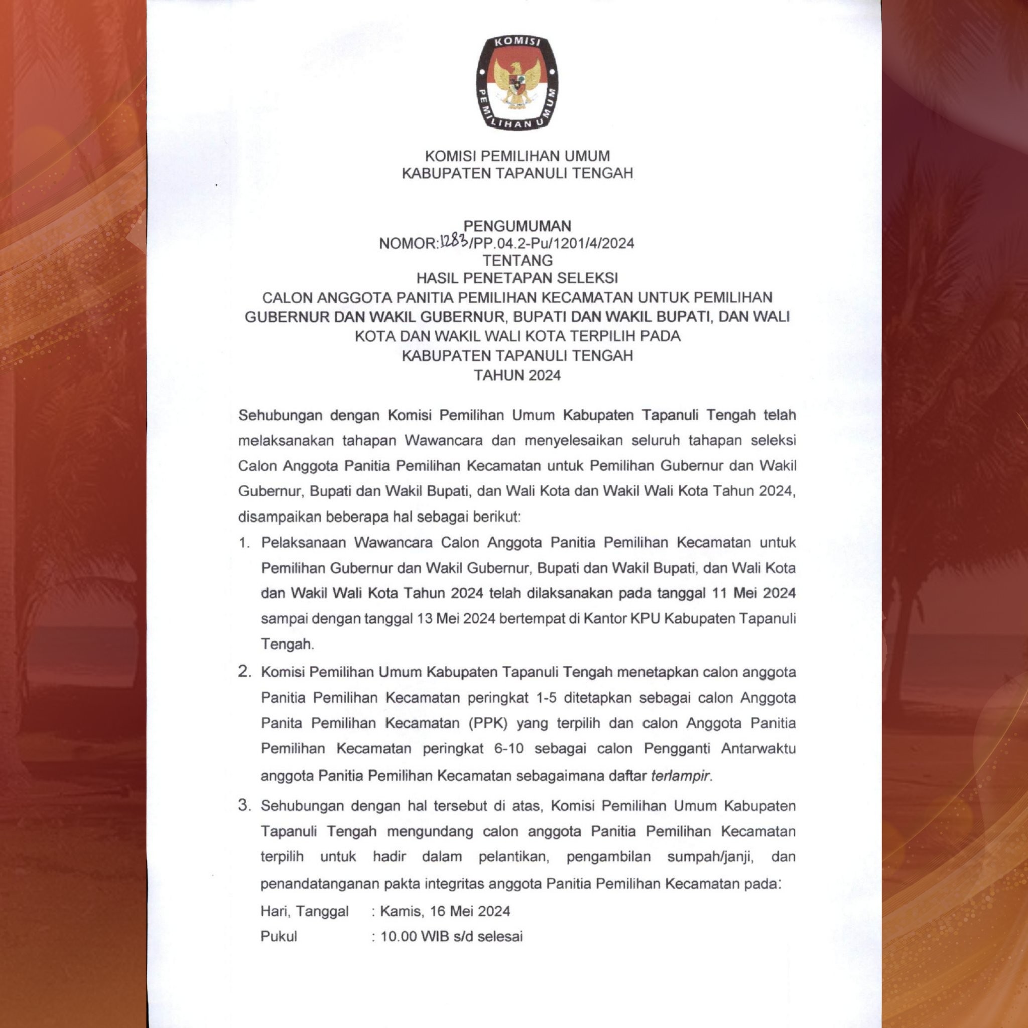 #TemanPemilih berikut kami sampaikan Pengumuman Penetapan Hasil Seleksi Calon Anggota Panitia Pemungutan Suara (PPS) untuk Pemilihan Gubernur dan Wakil Gubernur, Bupati dan Wakil Bupati, serta Wali kota dan Wakil Wali Kota pada Kabupaten Tapanuli Tengah tahun 2024 sebagaimana terlampir,
