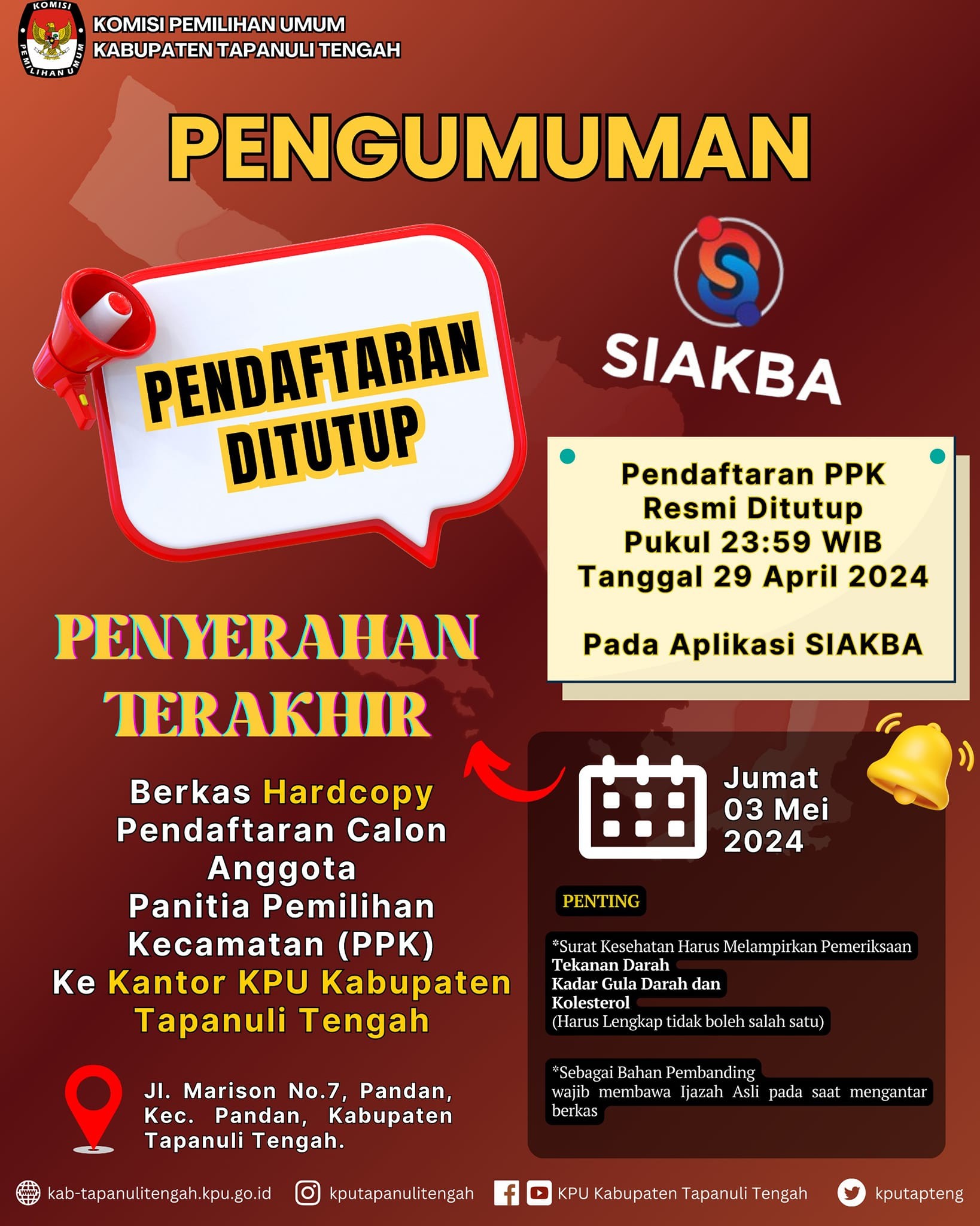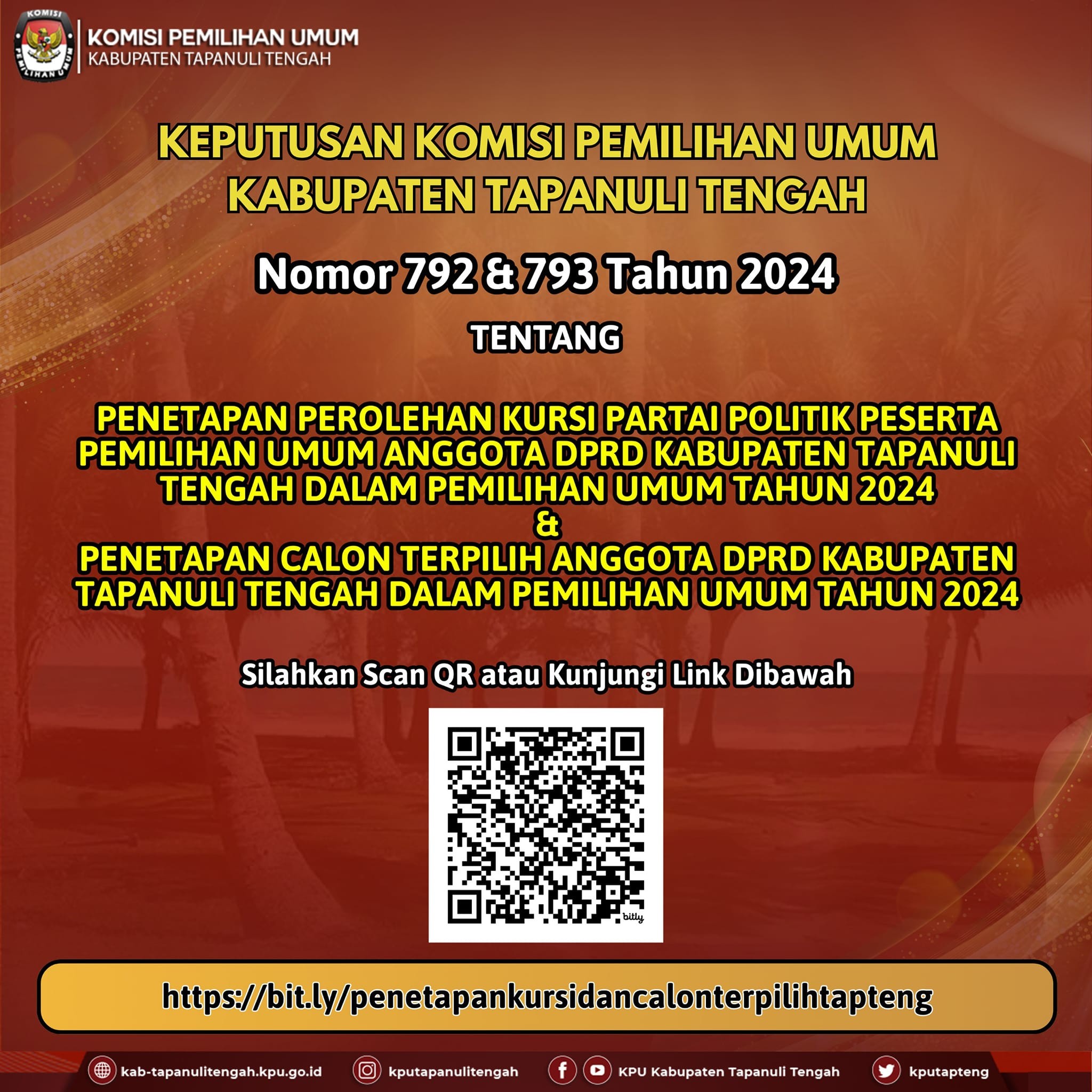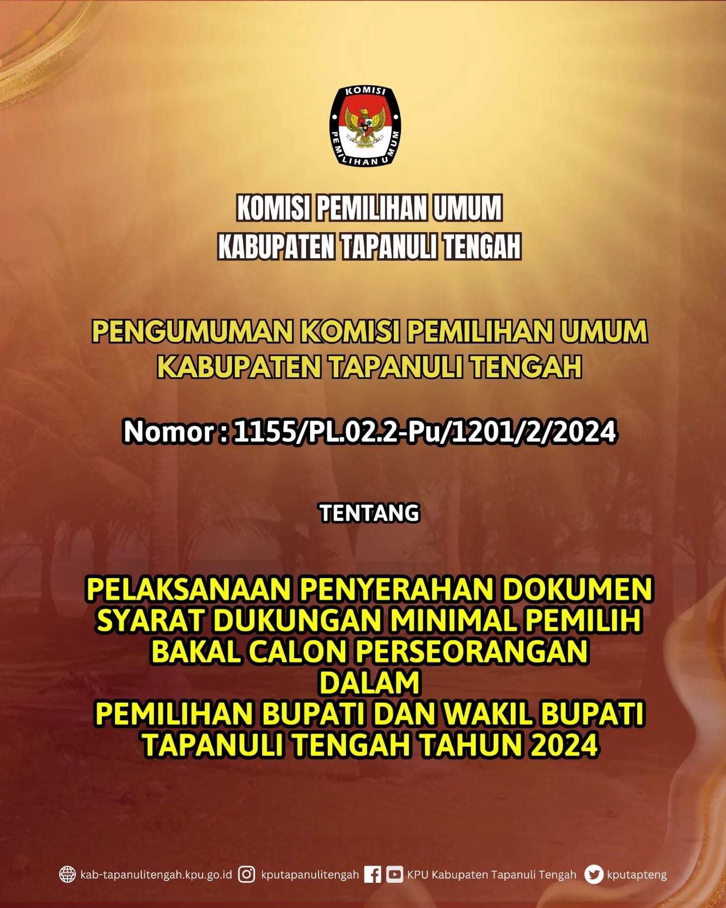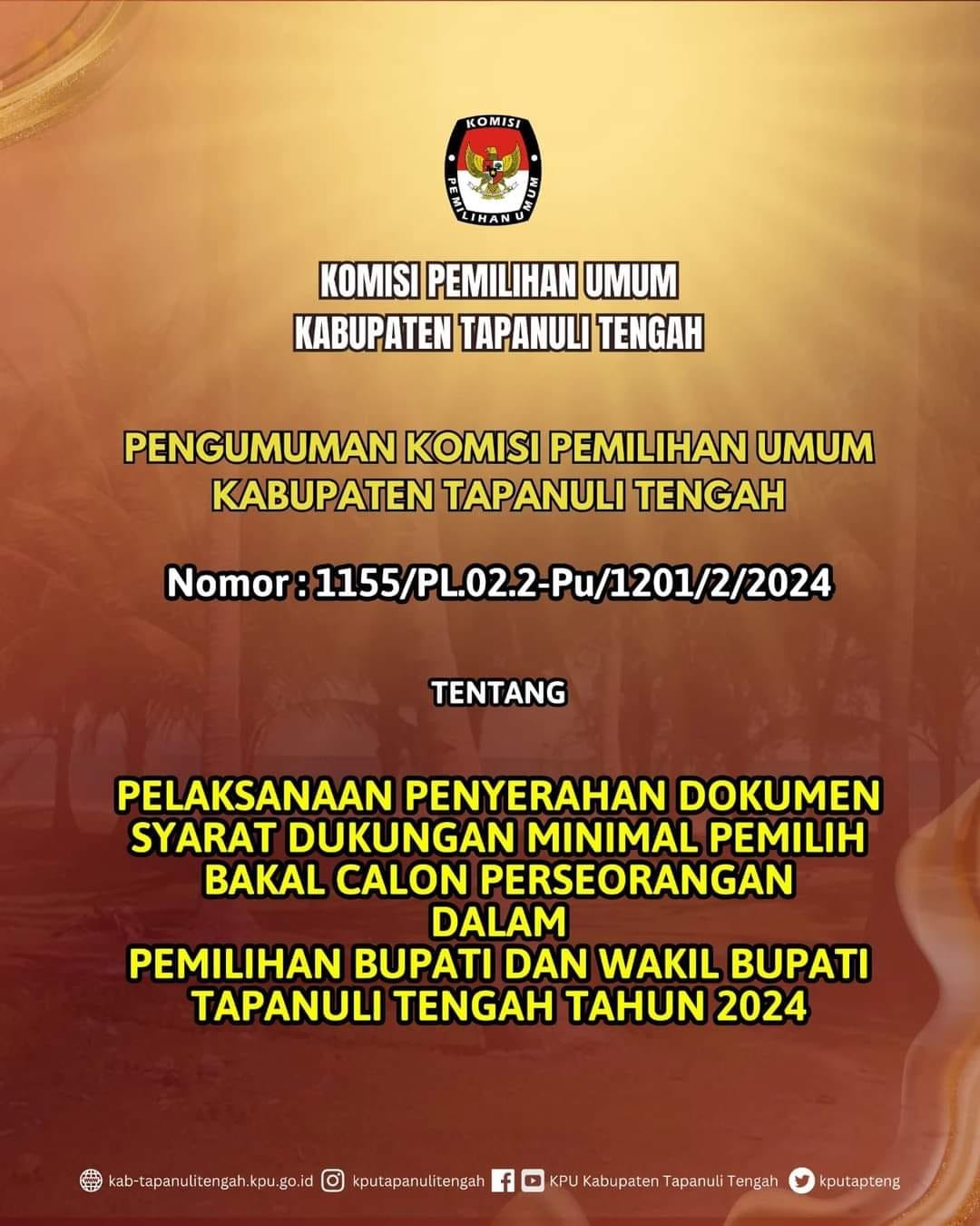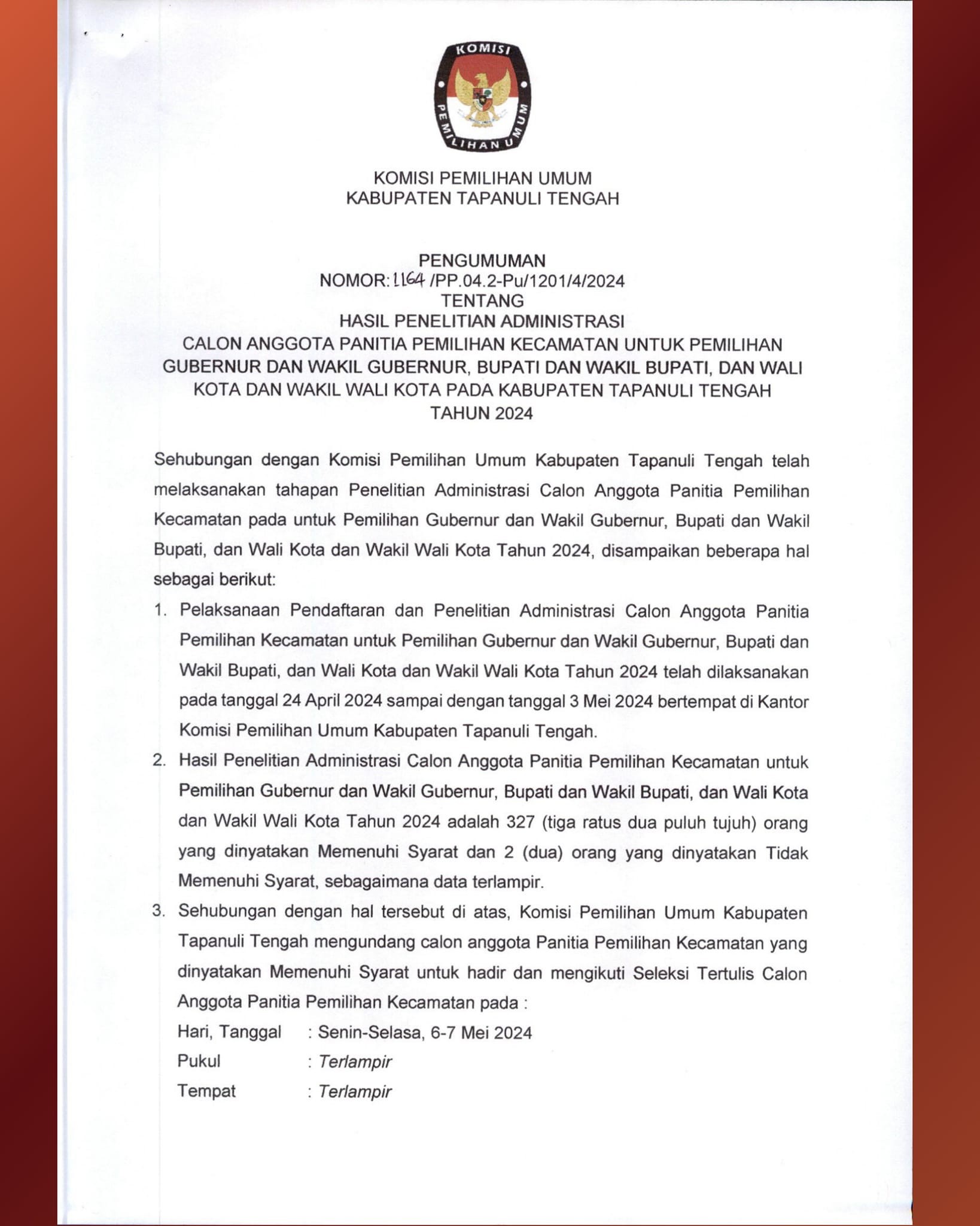 Hai #TemanPemilih, Berikut disampaikan Pengumuman KPU Kabuaten Tapanuli Tengah Nomor: 1164/PP.04.2-PU/1201/4/2024
