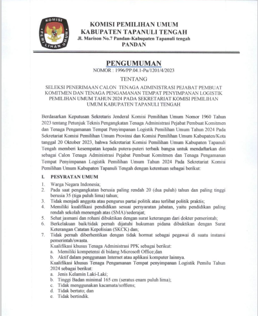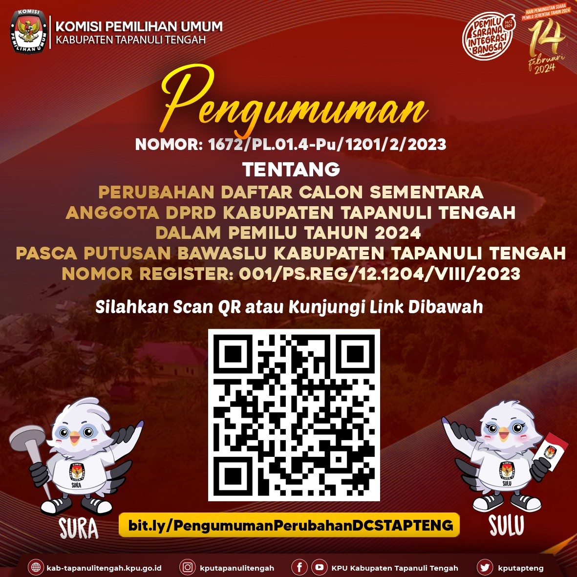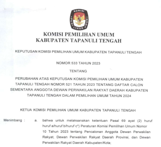 Berikut ini Pengumuman Perubahan Daftar Calon Sementara Anggota DPRD Kabupaten Tapanuli Tengah Dalam Pemlu Tahun 2024 Pasca Putusan Bawaslu Kabupaten Tapanuli Tengah Nomor Register: 001/PS.REG/12.1204/VIII/2023